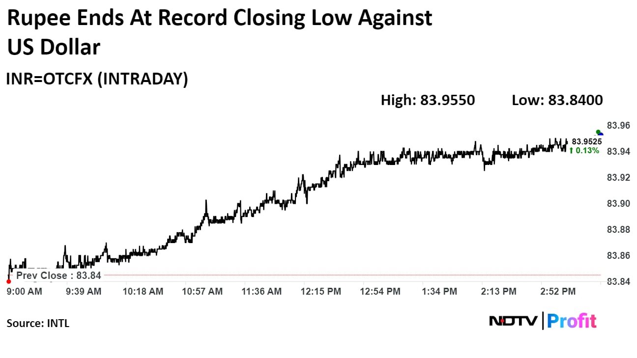 The local currency depreciated 12 paise to end at an all-time low of Rs 83.96, according to Bloomberg data. It had closed at Rs 83.84 against the greenback on Monday. The currency had opened at Rs 83.86 against the dollar.