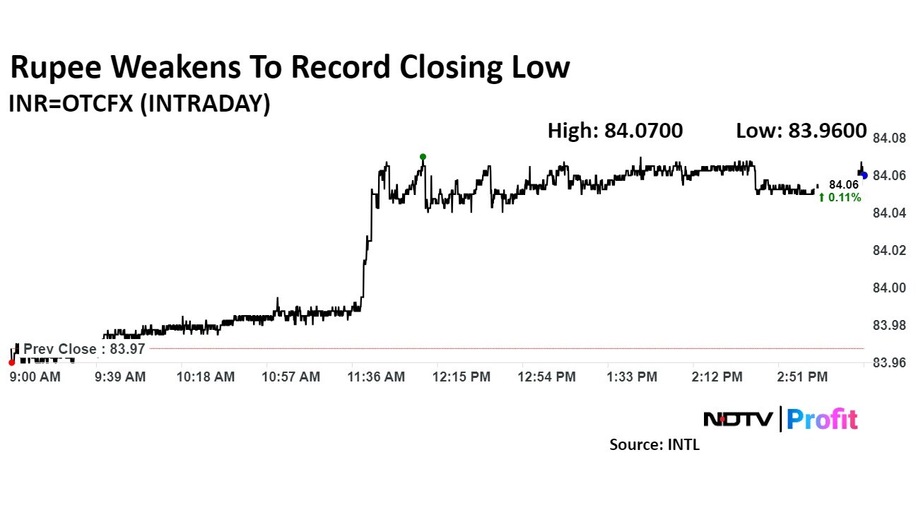 The rupee closed weaker against the US dollar on Friday, surpassing the psychological barrier of the 84 mark against the US dollar, according to Bloomberg. (Photographer: Pralhad Shinde/NDTV Profit)