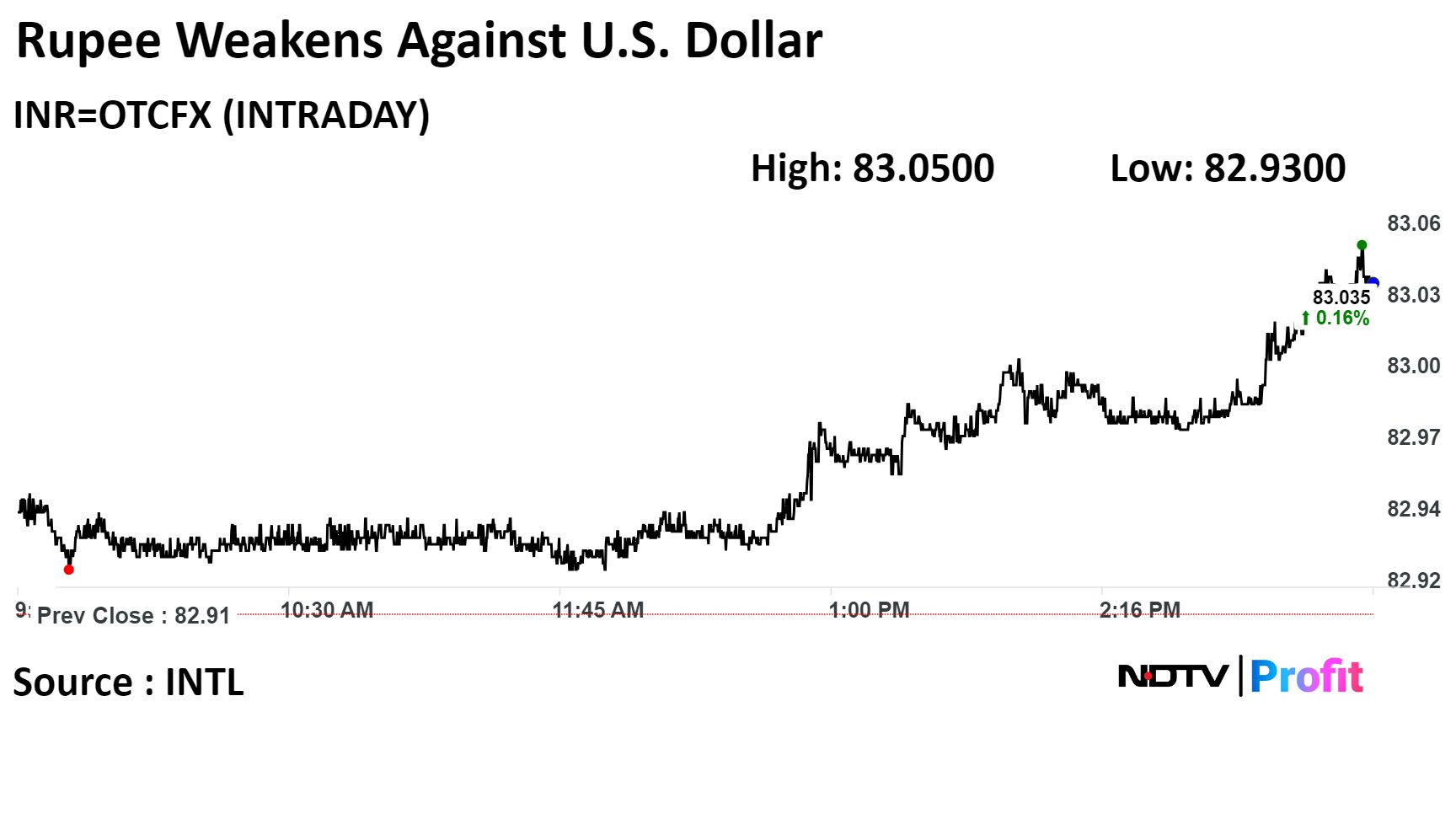 The local currency weakened by 13 paise to close at Rs 83.04 against the U.S. dollar, after opening at Rs 82.94. It closed at Rs 82.91 against the dollar on Monday, according to Bloomberg data.