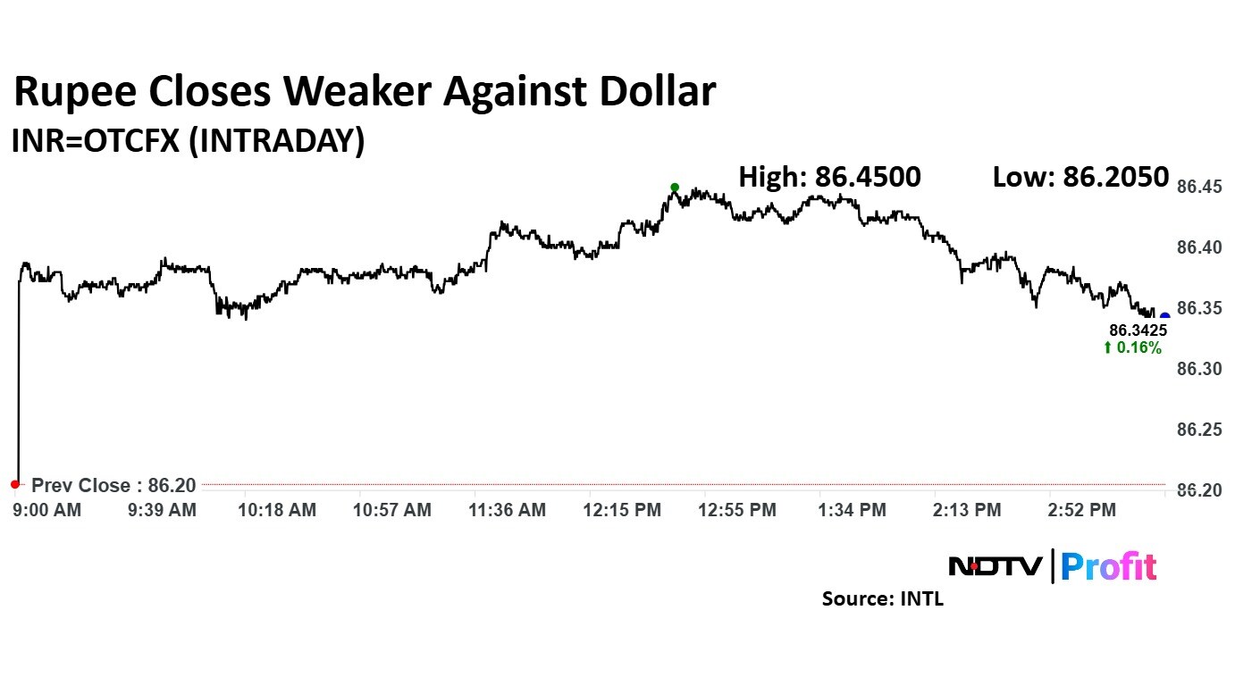 The Indian rupee closed weaker against the US dollar on Monday. The domestic currency weakened by 13 paise to close at 86.34 against the US dollar.