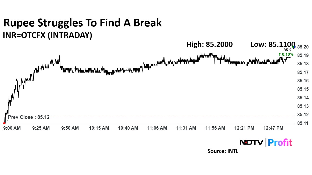 Indian rupee weakened 7 paise by midday on Tuesday to a new record low of 85.20 per US dollar as the greenback maintained its strength.