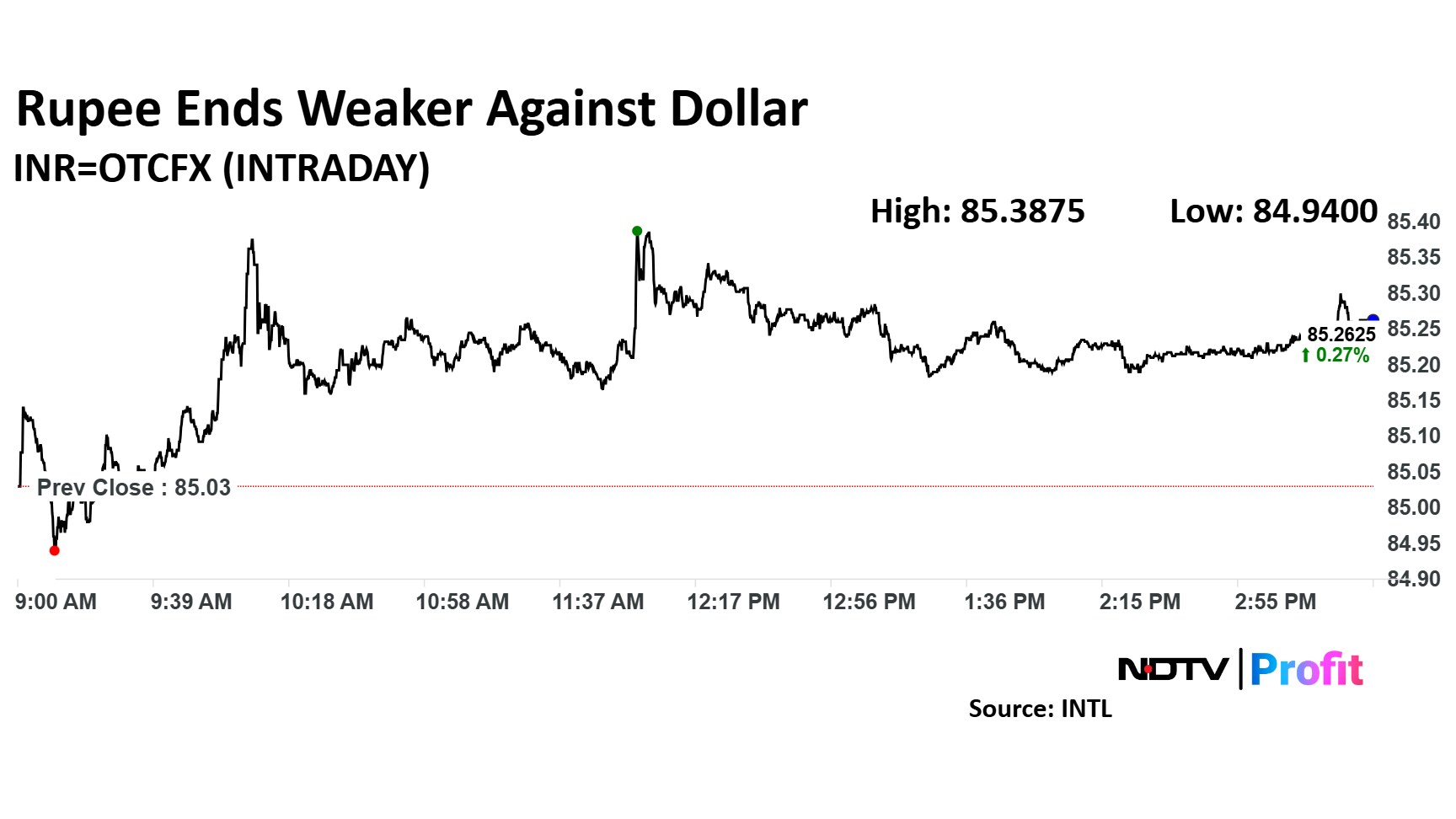 The Indian rupee closed 22 paise weaker against the US Dollar on Tuesday at 85.26, in contrast to a stronger close at 85.03 on Monday, according to Bloomberg.