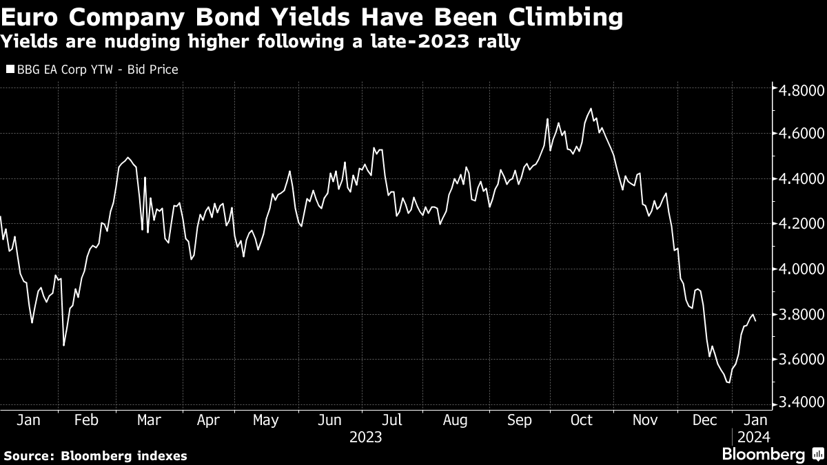 Average yields on euro-denominated company bonds have risen to about 3.7% in a slight unwind of 2023's late-year rally, when spreads plunged as expectation grew for multiple rate cuts this year.