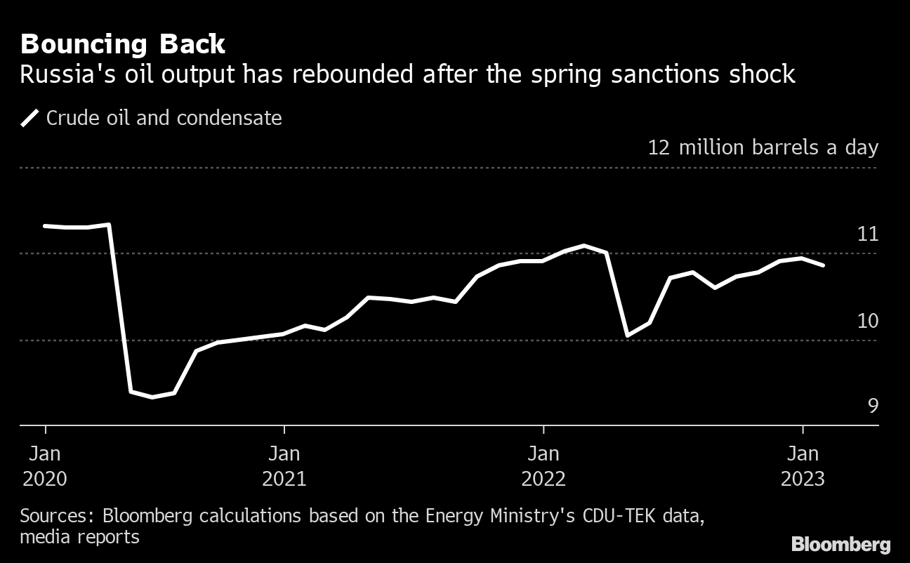 Since hitting a post-invasion low of 10.05 million barrels a day in April, Russian oil output rebounded to around 10.9 million at the end of 2022. It stayed close to that level in January, despite the European Union's ban on most seaborne imports of the country's crude on Dec. 5.