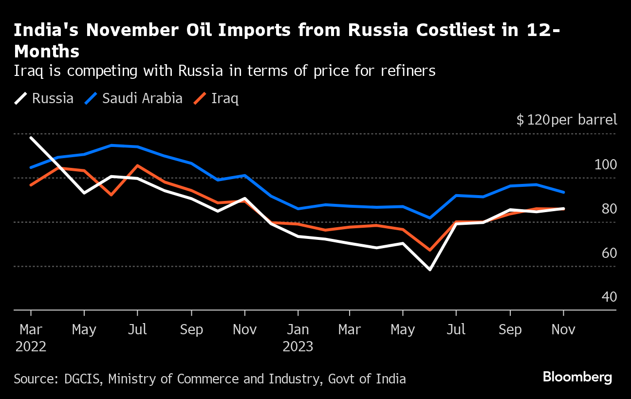 (Bloomberg) -- India's crude oil imports from Russia in November were the costliest in a year, government data show, reflecting lowering discounts on the fuel.