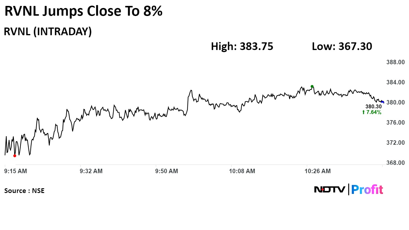 RNVL's stock rose as much as 8.41% during the day to Rs 383 apiece on the National Stock Exchange. It was trading 8% higher at Rs 381.85 per share, compared to a 0.98% advance in the benchmark Nifty at 10:20 a.m.