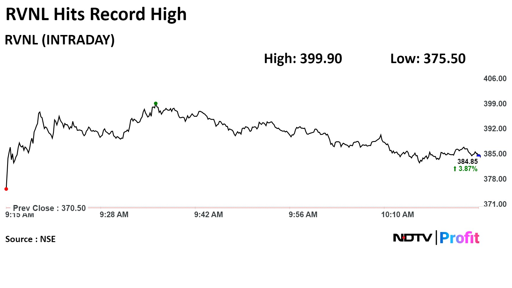 The scrip rose as much as 7.94% to Rs 399.90 apiece, the highest level. It pared gains to trade 3.5% higher at Rs 383.25 apiece, as of 10:28 a.m. This compares to a 0.07% advance in the NSE Nifty 50 Index.