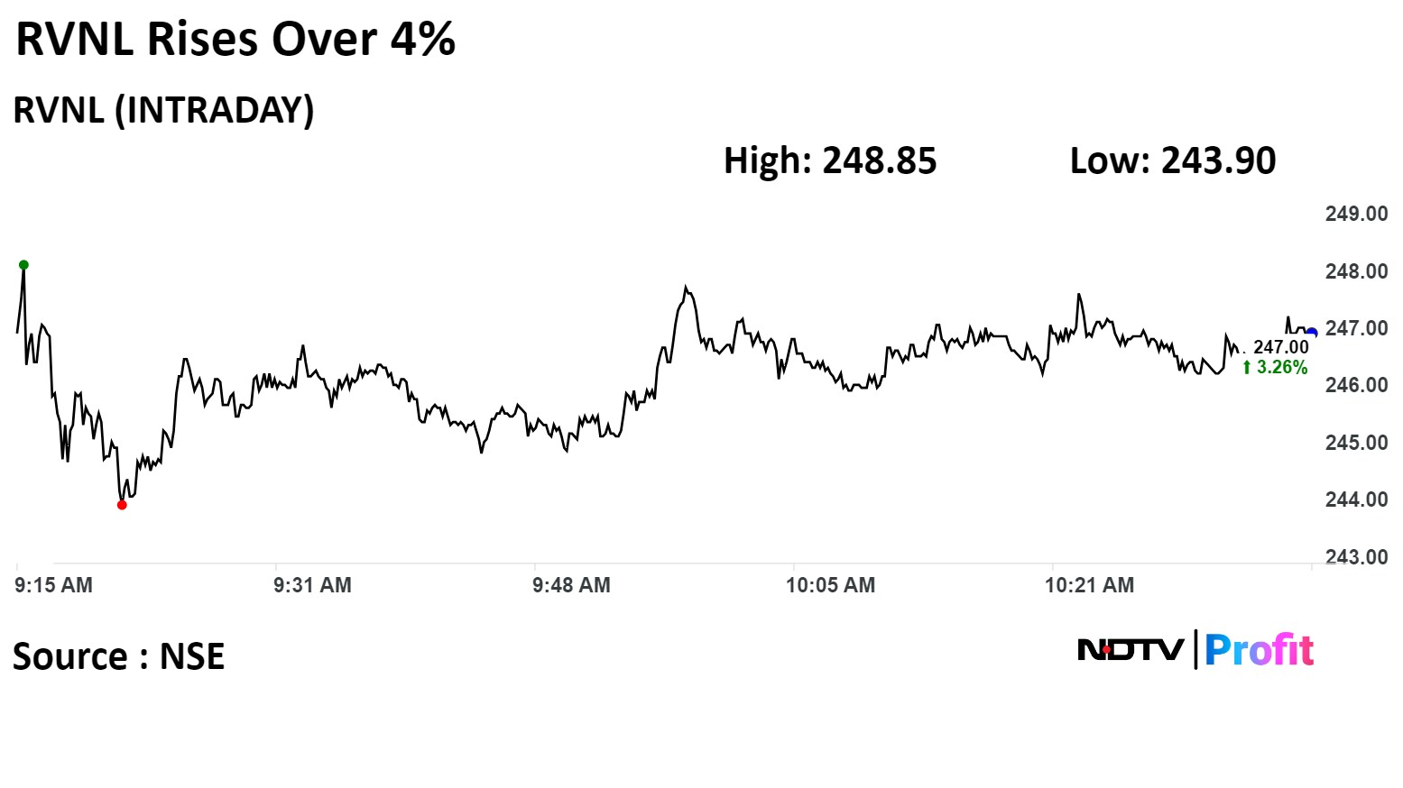 Shares of Rail Vikas Nigam rose as much as 4.03%, the highest level since March 18, before paring gains to trade 3.05% higher as of 10:31 a.m. This compares to a 0.98% advance in the NSE Nifty 50.