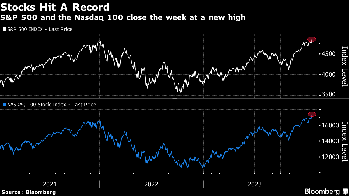After a wobbly start to the year, the S&P 500 scored a second weekly gain, pushing the index to a new high. Tech stocks led the way, with the Nasdaq 100 hitting a record and climbing almost 3% for the week. Meanwhile, Treasuries that closed 2023 with a historic rally have notched losses in the new year with yields climbing across the curve.