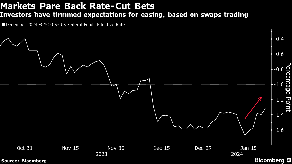 This comes as a slew of US central bank officials push back on rate-cut speculation. Fed Bank of Atlanta President Raphael Bostic urged policymakers to proceed cautiously toward easing, while Fed Governor Christopher Waller appeared to question the need for aggressive rate cuts, at least for now. Accordingly, traders who ended 2023 expecting six rate cuts this year have pared the wager to five and become less certain they will begin in March as they were at year-end.
