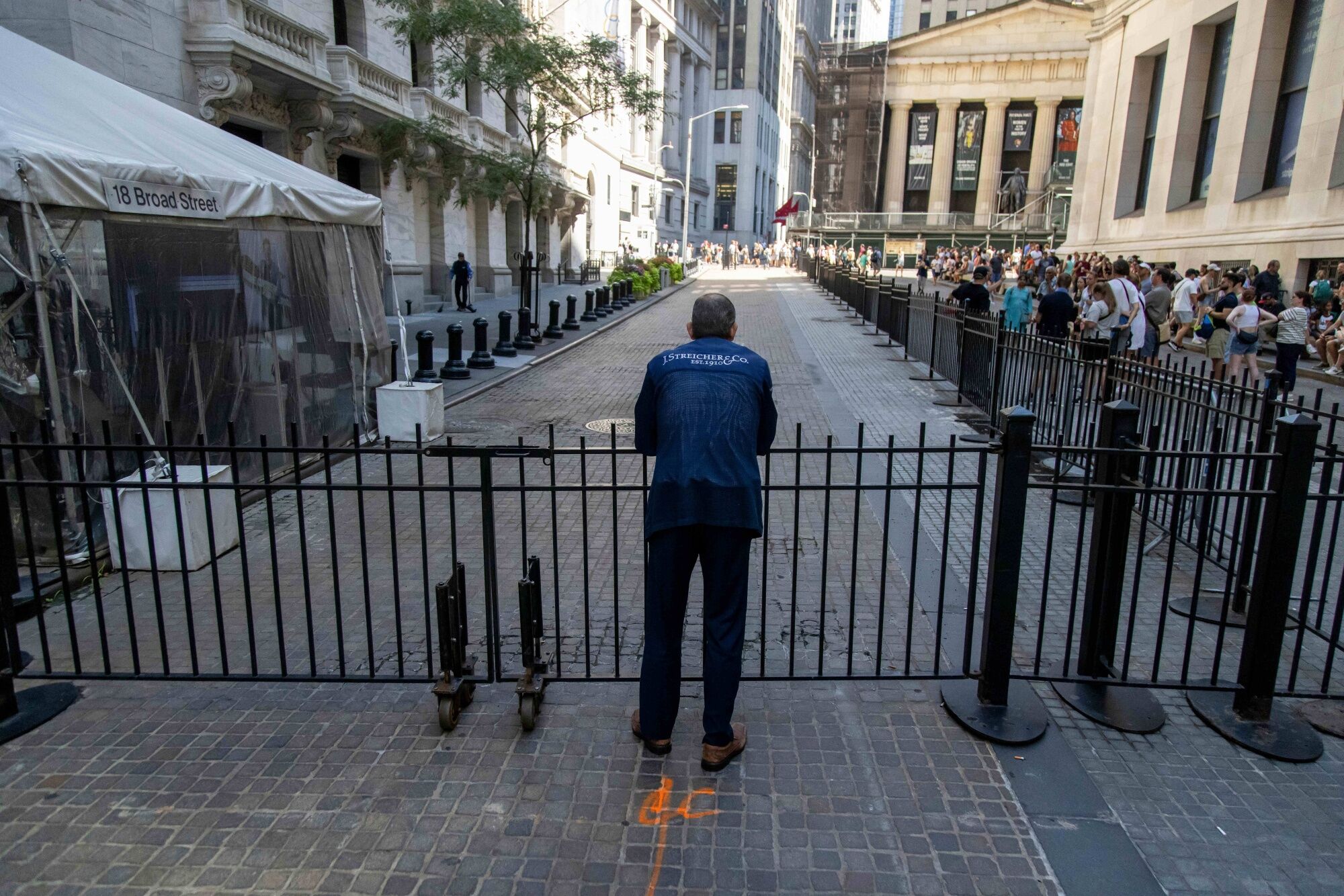 A trader in front of the New York Stock Exchange (NYSE) in New York, US, on Monday, Aug. 5, 2024. A selloff in the riskier corners of the global market deepened, with stocks plunging and traders rushing to the safety of bonds as concerns about a slowdown in the world's largest economy intensified. Photographer: Michael Nagle/Bloomberg