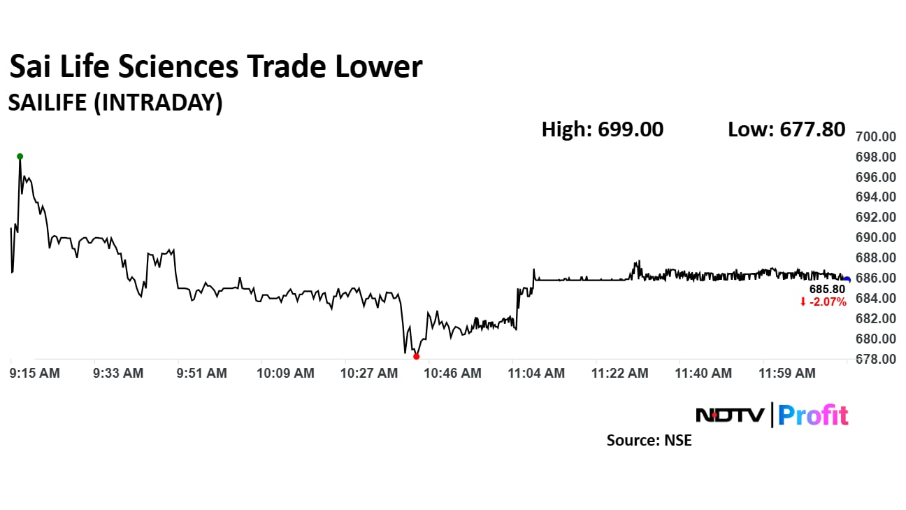 Sai Life Sciences' share price declined 3.21% to Rs 677.80 apiece, the lowest level since March 10. It was trading 2.06% down at Rs 685.90 apiece as of 12:09 p.m., as compared to a 0.50% advance in the NSE Nifty 50. The counter also ended its second anchor investors' lock-in period.