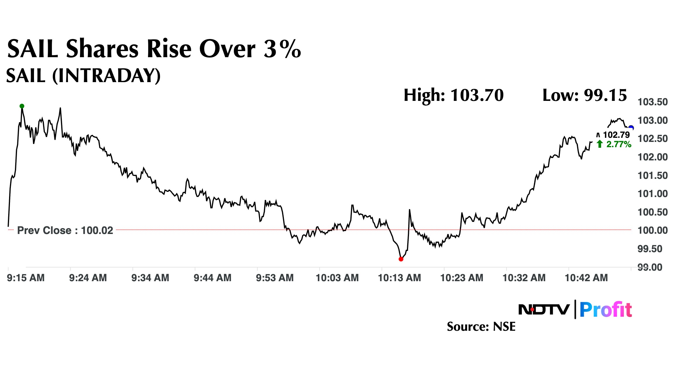 SAIL's share price rose as much as 3.68% to Rs 103.7 apiece, the highest level since May. 22, 2024. However, it pared gains to trade 2.8% higher at Rs 102.8 apiece, as of 10:49 a.m. This compares to a 0.55% decline in the NSE Nifty 50 Index.