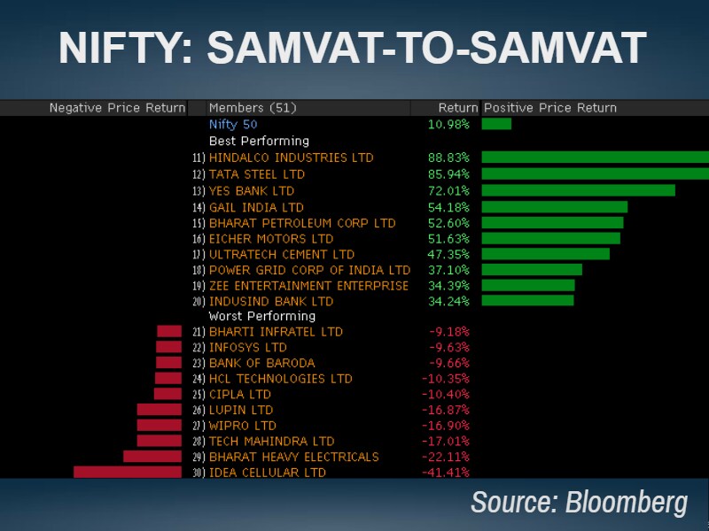 The Sensex has climbed 8 percent since last Diwali on November 11, 2015, as overseas investors stepped up purchases of local shares. Twenty two of the 30 index members have risen since last year’s Muhurat day, powered by Tata Steel Ltd.’s 83 percent rally and GAIL India Ltd.’s 54 percent advance. Software maker Wipro Ltd. and Lupin Ltd., a drugmaker, fell 17 percent and 16 percent respectively.
