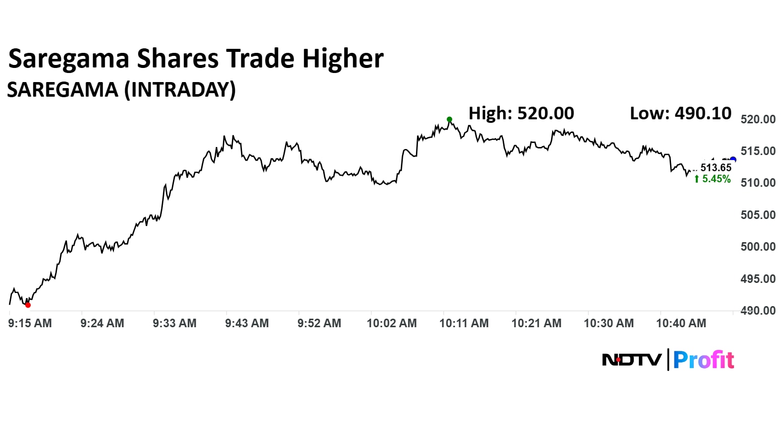 Shares of Saregama rose as much as 6.75% to Rs 520 apiece. They pared gains to trade 5.45% higher at Rs 513.65 apiece, as of 10:45 a.m. This compares to a 0.66% decline in the NSE Nifty 50.
