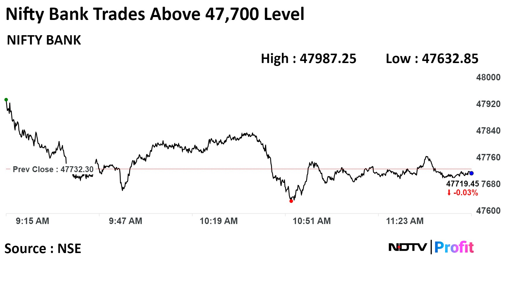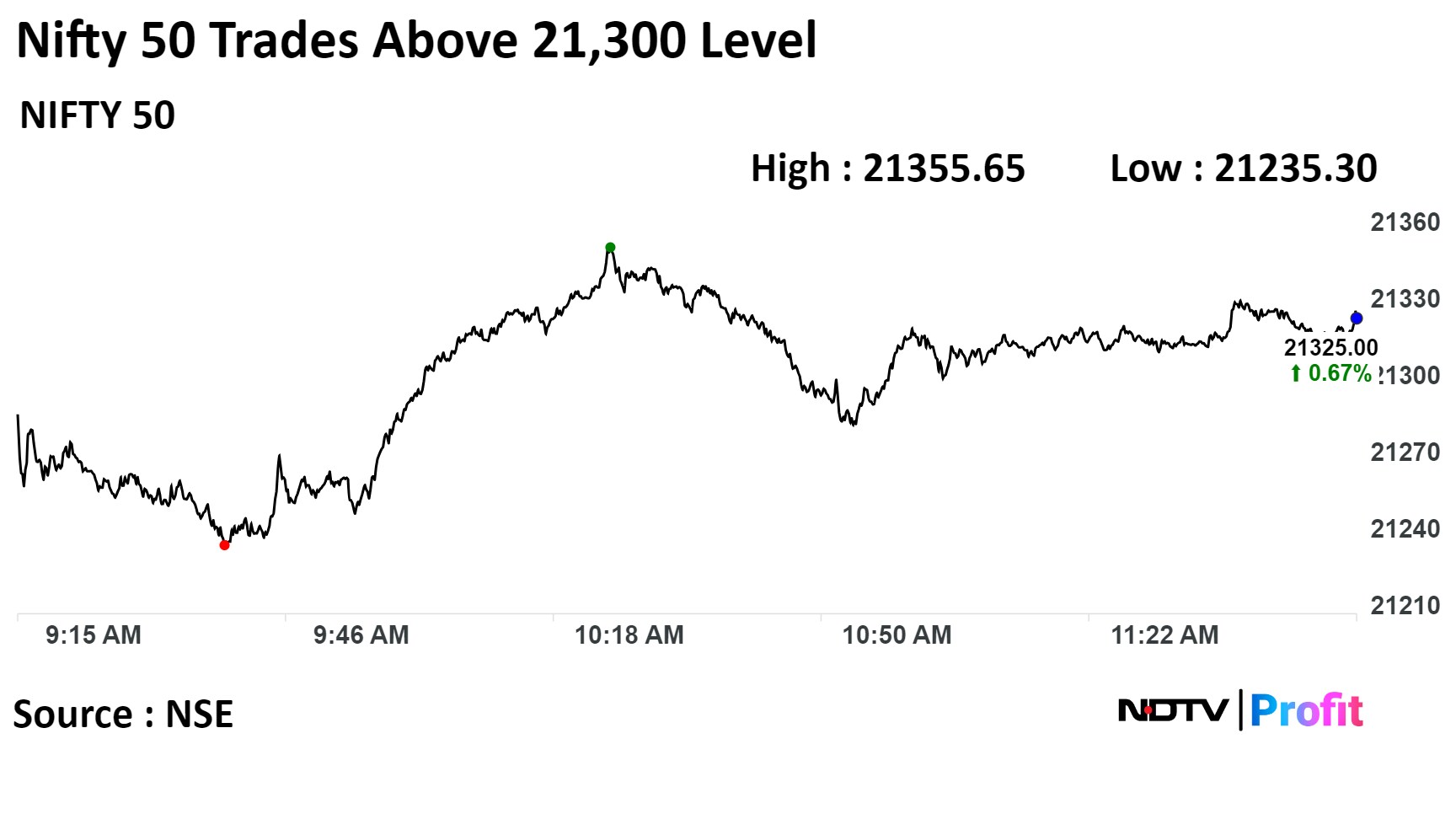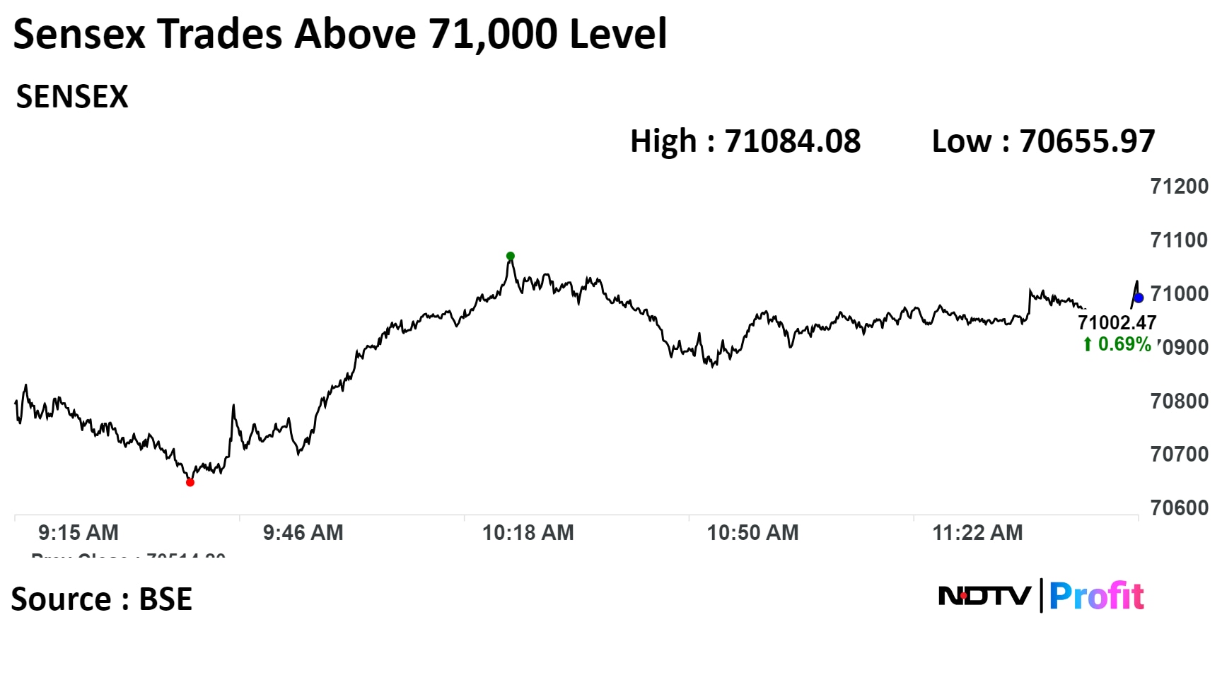 As of 11:45 a.m., the S&P BSE Sensex rose 462.86 points, or 0.66% at 70,977.06, while the NSE Nifty 50 was up 143.70 points or 0.68% at 21,326.40.