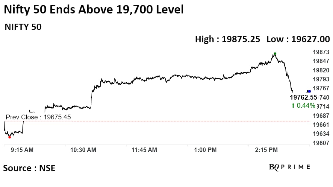 The S&P BSE Sensex closed 307 points, or 0.47%, higher at 65,982.48, while the NSE Nifty 50 ended 90 points, or 0.46%, up at 19,765.20.