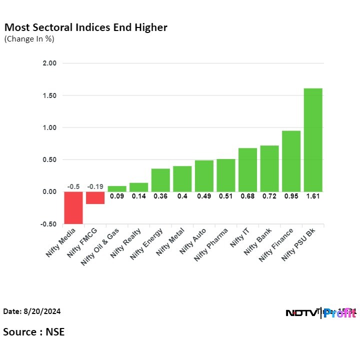 Except Nifty Media and FMCG, all sectoral indices on the NSE closed higher, with PSU Bank rising the most.