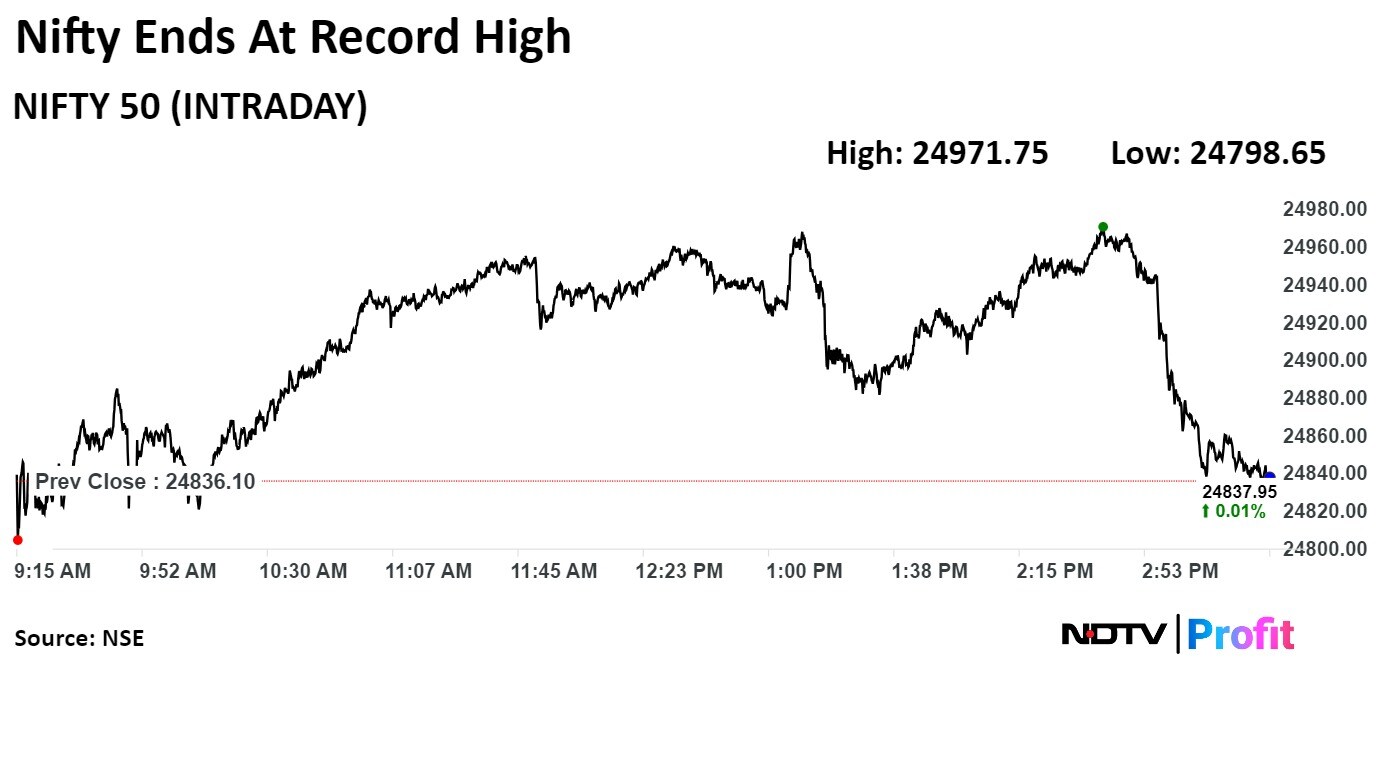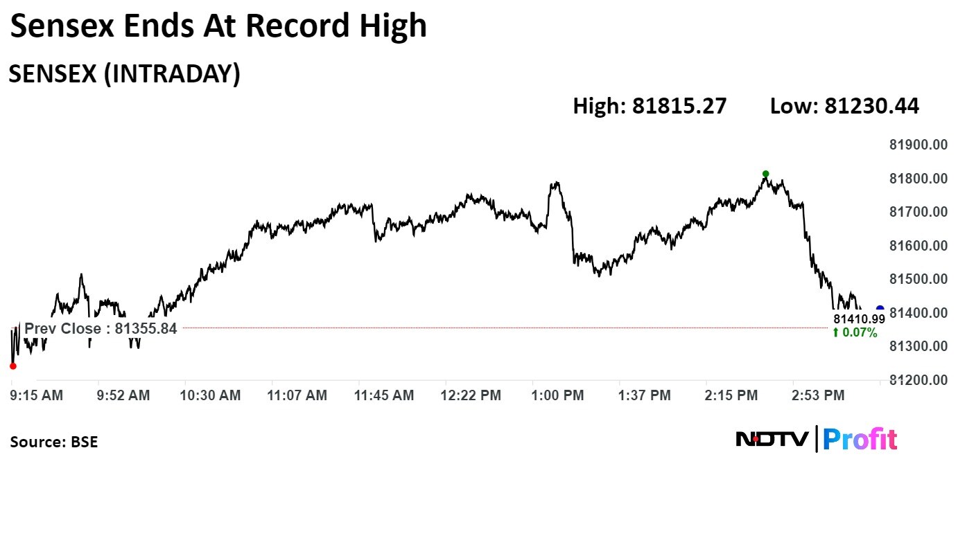 Both indices closed at their highest levels. The NSE Nifty 50 closed at 24,857.30, up 0.09% or 21.20 points, and the S&P BSE Sensex closed at 81,455.40, up 0.12% or 99.56 points.