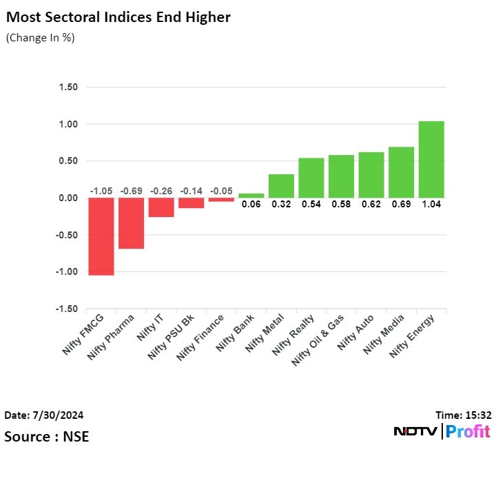 Seven of the 12 sectoral indices closed higher, led by Nifty Energy. While Nifty FMCG was the top loser.