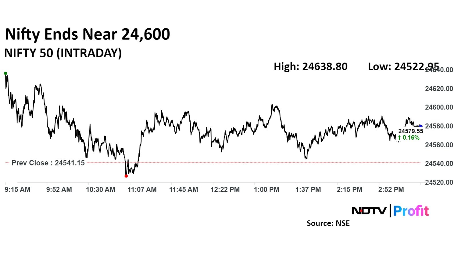 The NSE Nifty 50 ended 31.50 points or 0.13% higher at 24,572.65, and the BSE Sensex settled 12.16 points or 0.02% lower at 80,424.68.