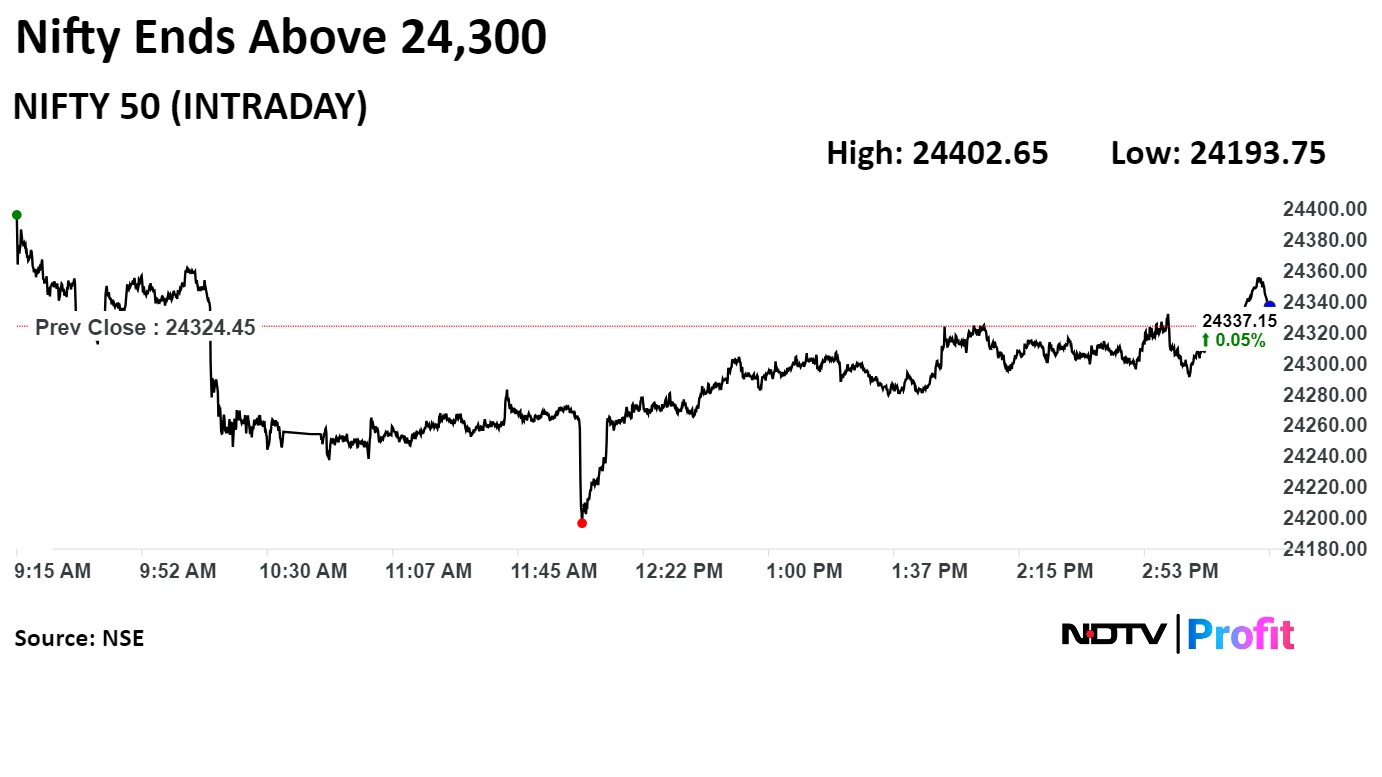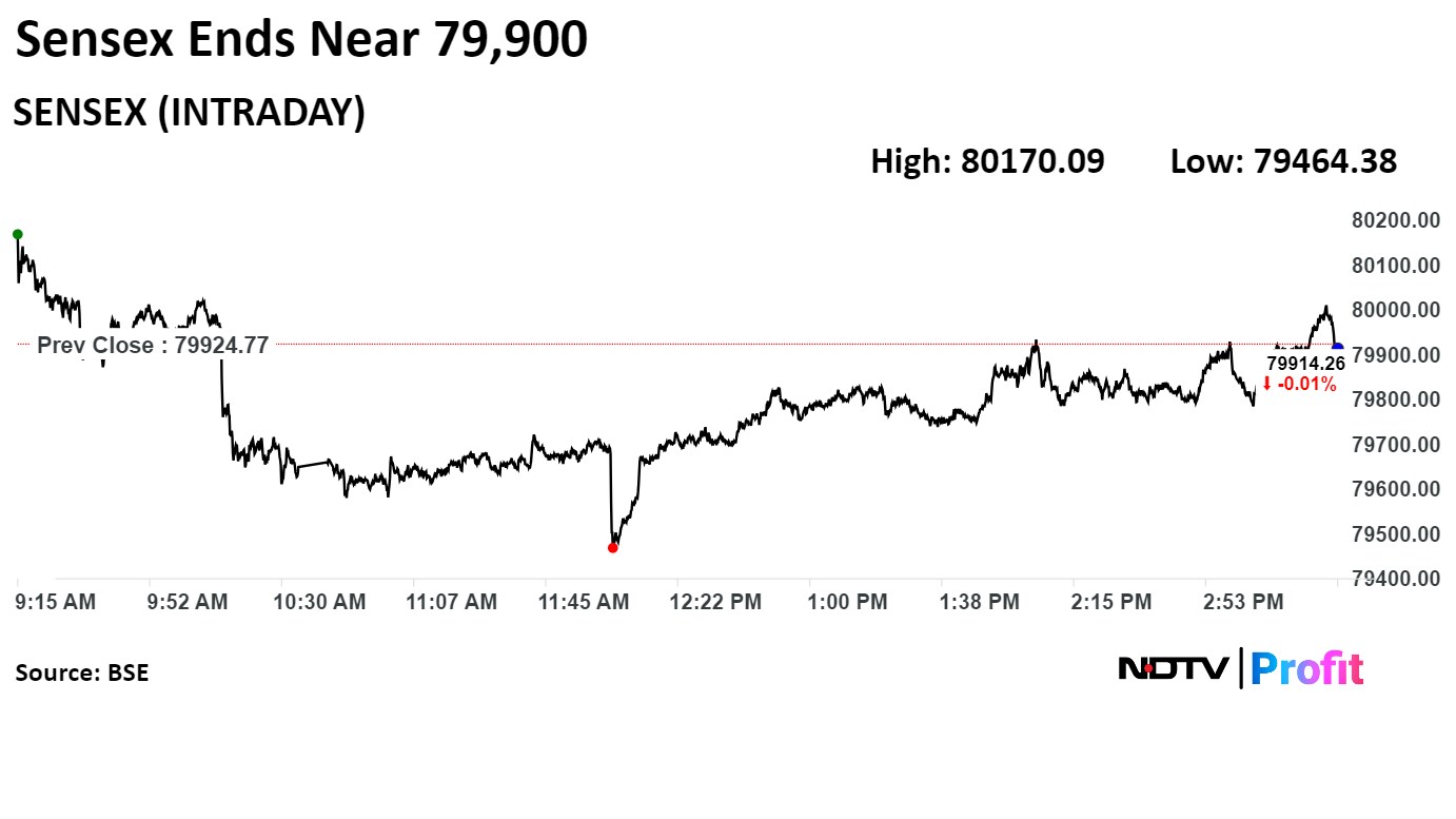 The NSE Nifty 50 settled 8.50 points or 0.04%, lower at 24,315.95, and the S&P BSE Sensex closed at 27.43 points or 0.03%, lower at 79,897.34.