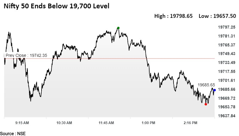 India's benchmark stock indices closed lower for the fourth consecutive day after swinging between gains and losses through Friday. The S&P BSE Sensex closed 221 points, or 0.33%, lower at 66,009.15, while the NSE Nifty 50 declined 68 points, or 0.34%, to end at 19,674.25.