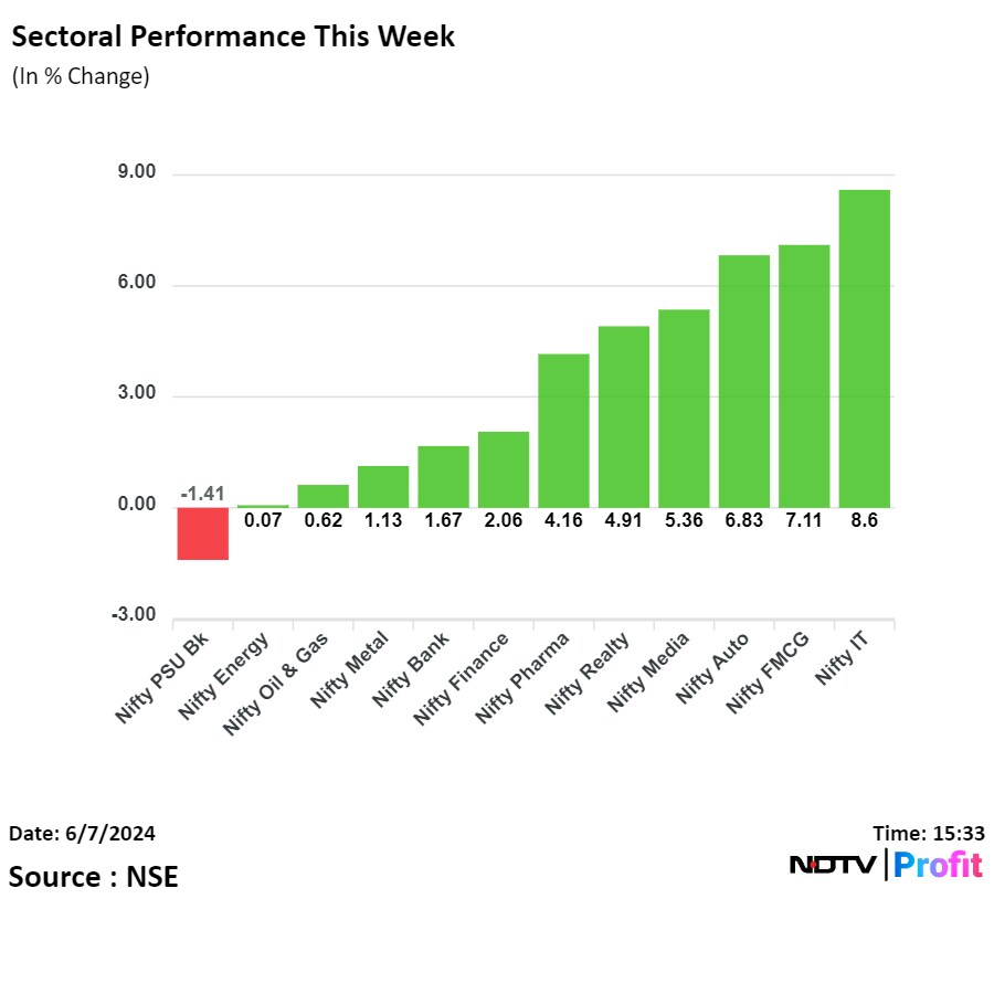 Most sectoral indices on the NSE ended the week higher. The Nifty IT gained nearly 9% and the Nifty PSU Bank was the only index that ended with weekly losses.