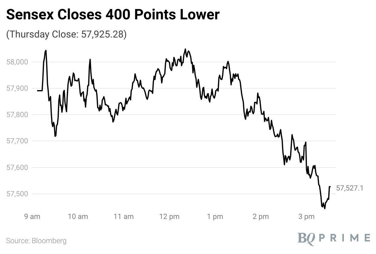 The Sensex closed 398 points down, or 0.69%, at 57,527.10, while the Nifty was lower by 132 points, or 0.77%, at 16,945.05.