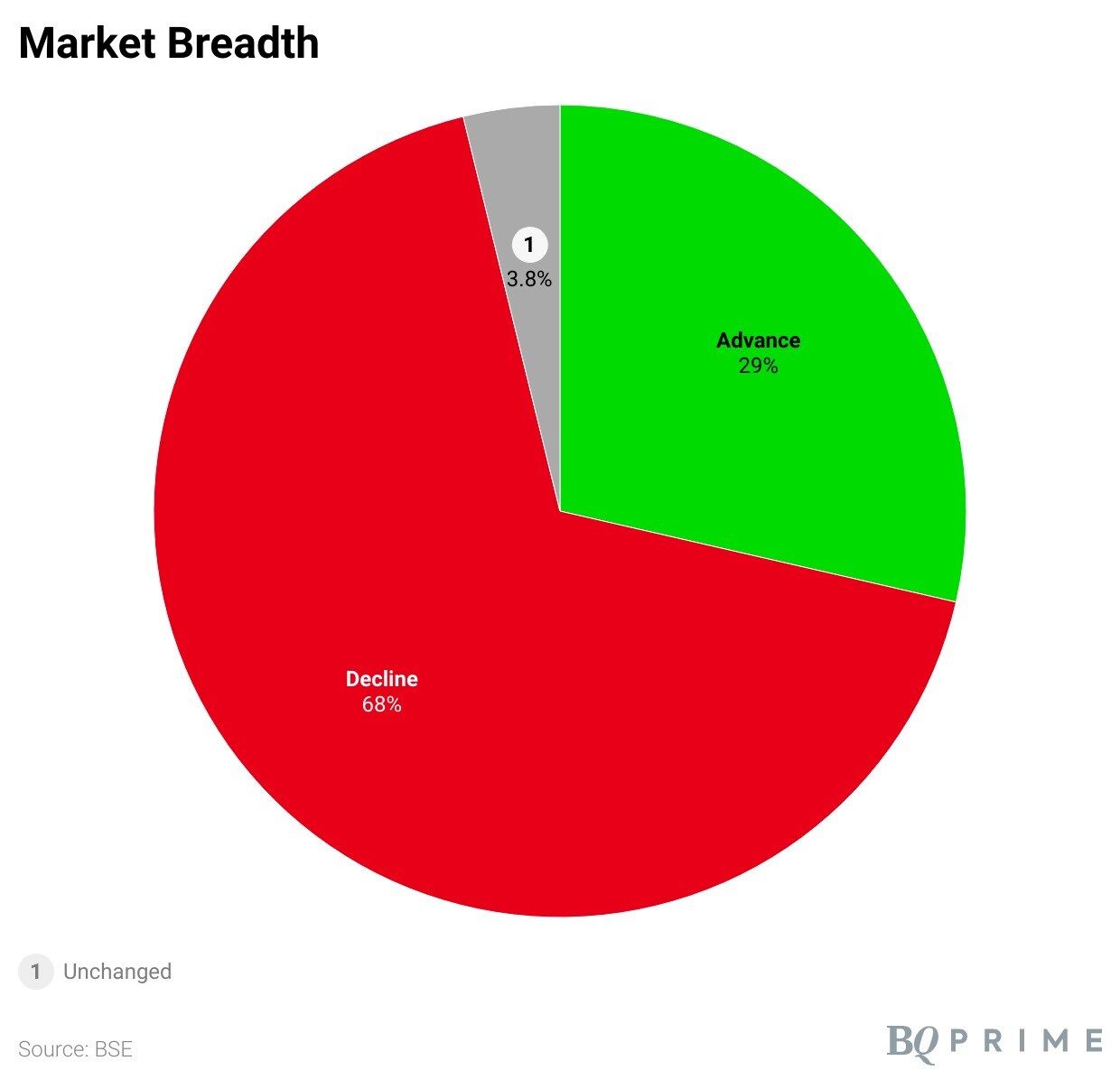 The market breadth was skewed in the favour of sellers. About 1,308 stocks rose, 2,019 declined and 139 remained unchanged on the BSE.