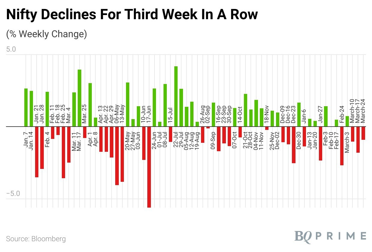 The S&P BSE Sensex was 9.10% lower, while the NSE Nifty 50 was 9.93% down from its previous high.