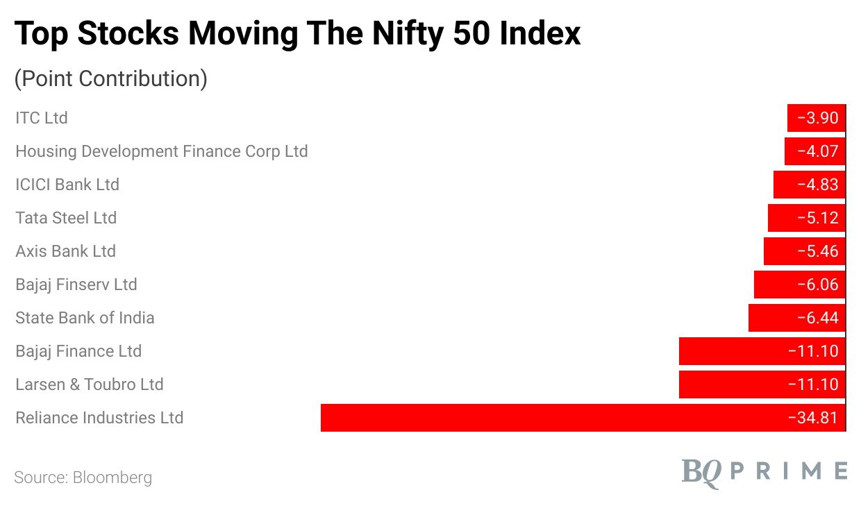 ITC Ltd., HDFC Bank Ltd., ICICI Bank Ltd., Tata Steel Ltd., Axis Bank Ltd., Bajaj Finserv Ltd., State Bank of India, Bajaj Finance Ltd., Larsen and Toubro Ltd. and Reliance Industries Ltd. were negatively adding to the change in Nifty.