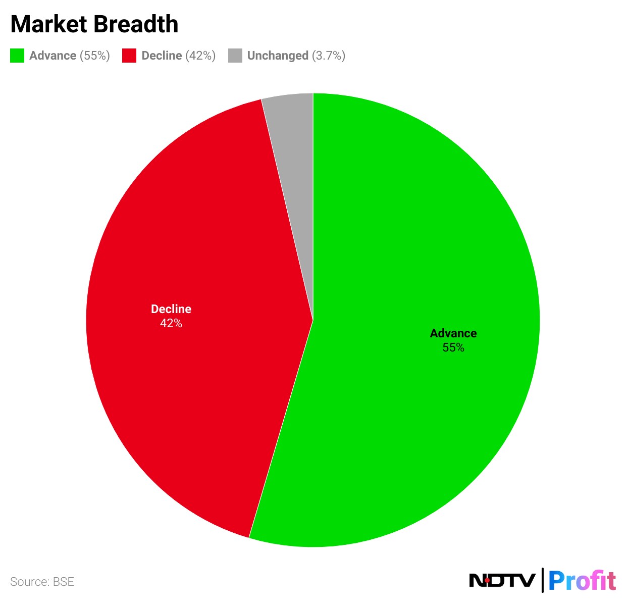 The market breadth was skewed in the favour of buyers. Around 2,127 stocks advanced, 1,628 declined, and 143 remained unchanged on the BSE.
