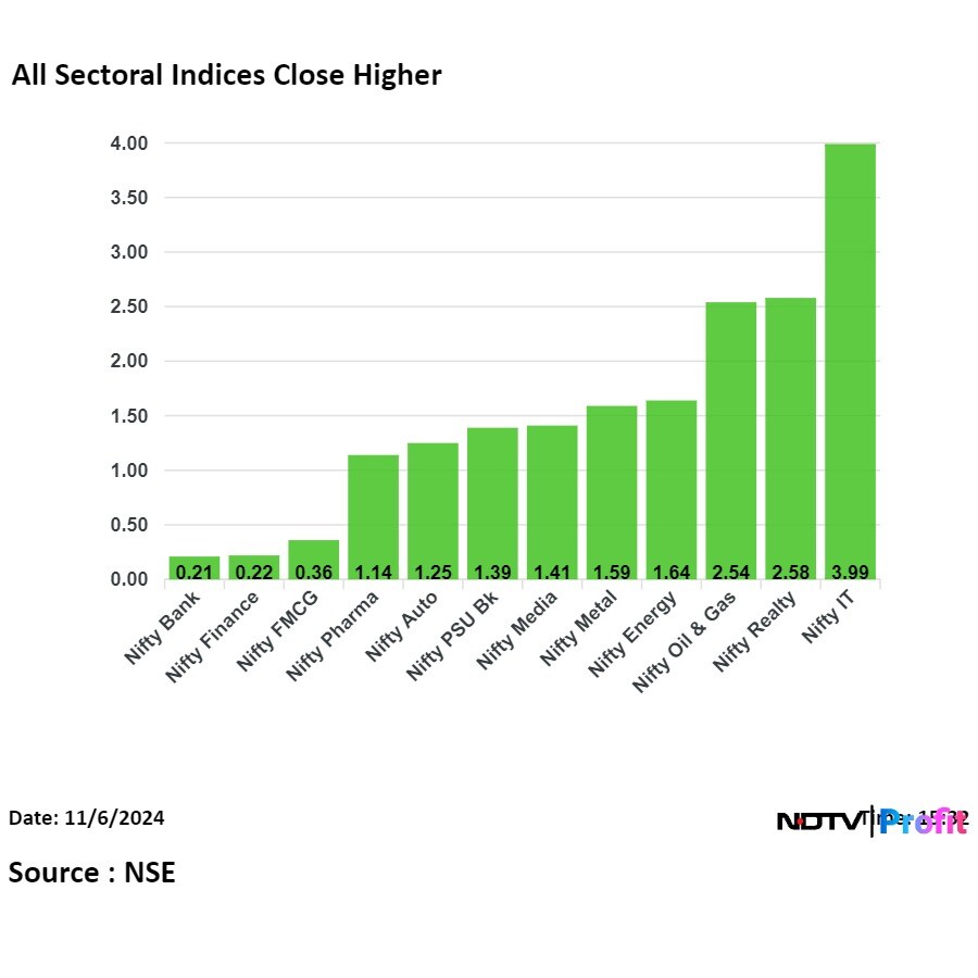 All the 12 sectoral indices on the NSE ended higher, with the Nifty IT, Realty and Oil & Gas rising the most.