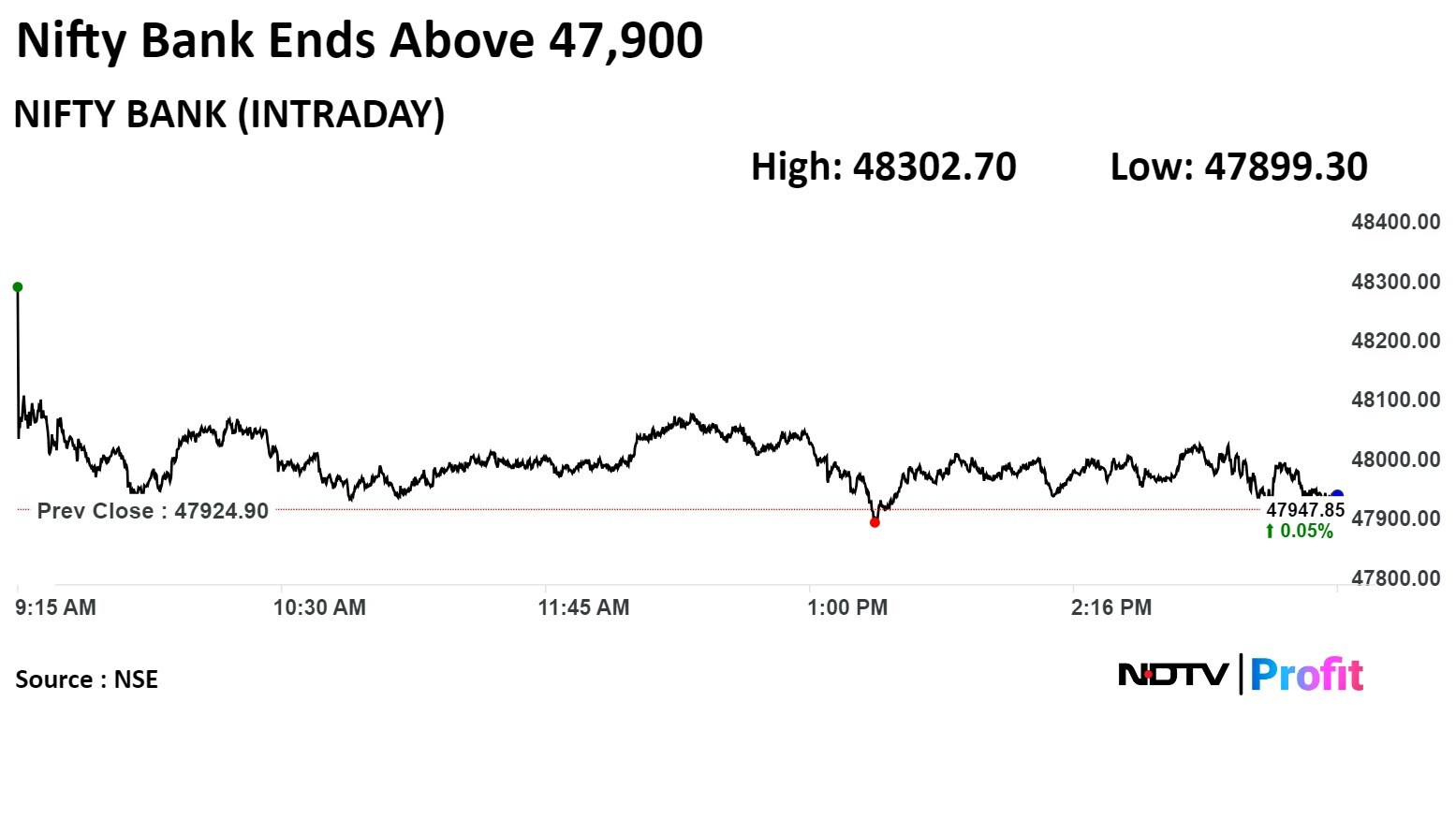 Sectoral indices on the NSE ended mixed, with the Nifty Realty rising the most by nearly 3%.