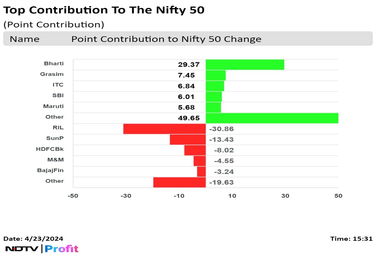 Shares of Bharti Airtel Ltd., Grasim Industries Ltd., ITC Ltd., State Bank of India, and Maruti Suzuki India Ltd. contributed the most to the gains in the Nifty.