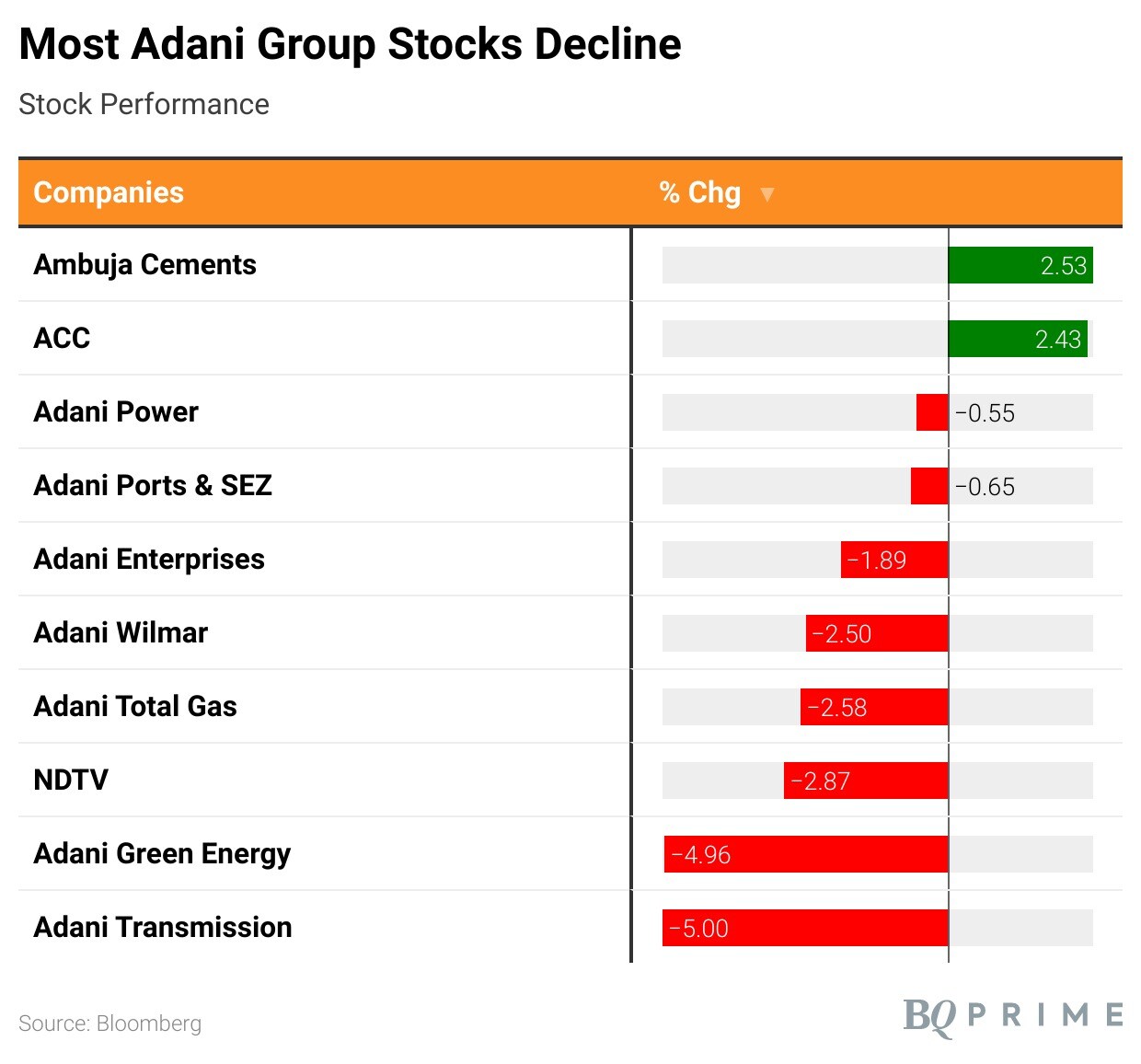 All Adani Group company stocks declined in trade, except ACC Ltd. and Ambuja Cements Ltd.