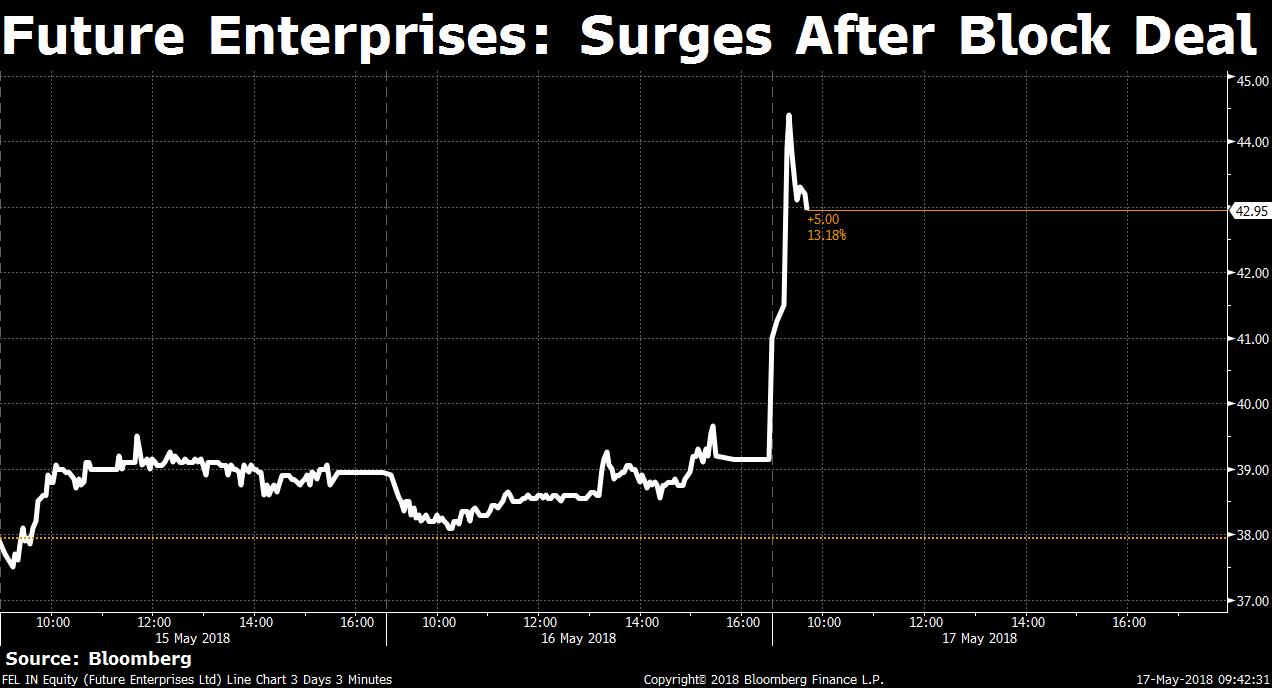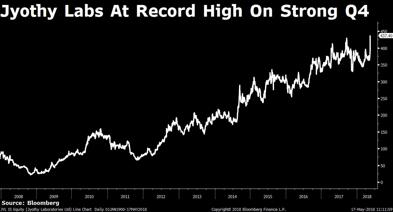Shares of the Chennai-based petrochemicals maker jumped as much as 20 percent—the most in nearly four years—to Rs 41.45 after posting a fourfold rise in quarterly profit.