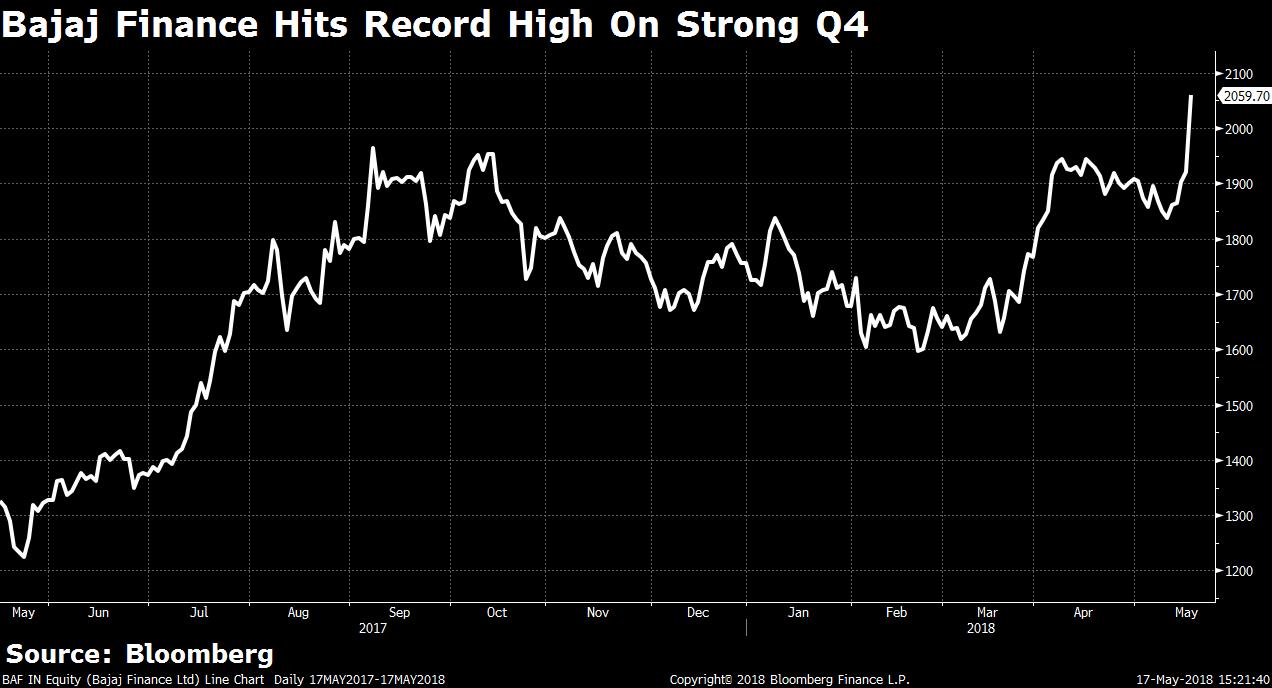 Shares of the Pune-based consumer finance lender rose 2.7 percent to record high of Rs 1,971.70 after it reported best quarterly profit in over six years, surpassing average analyst estimates tracked by Bloomberg.