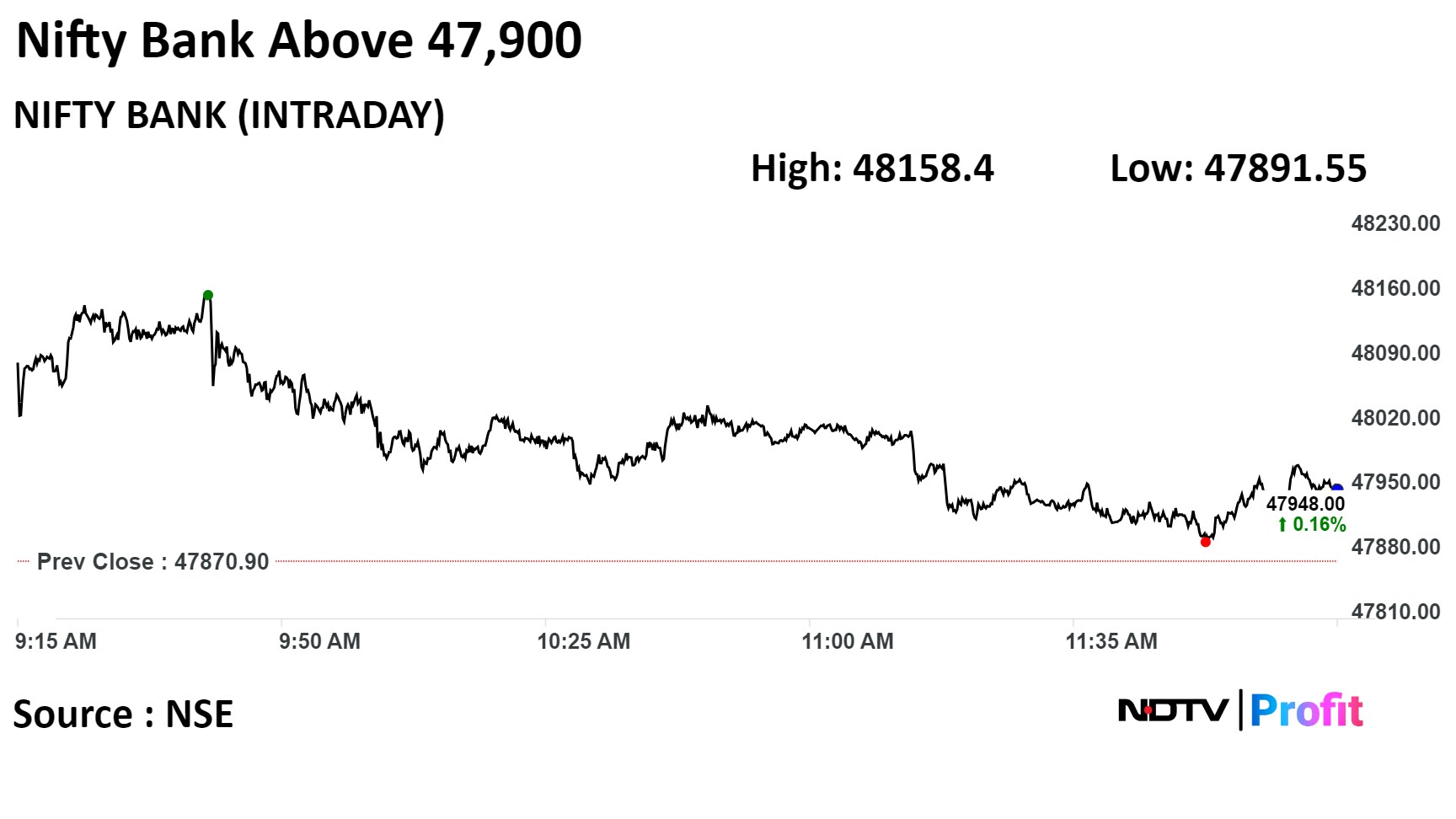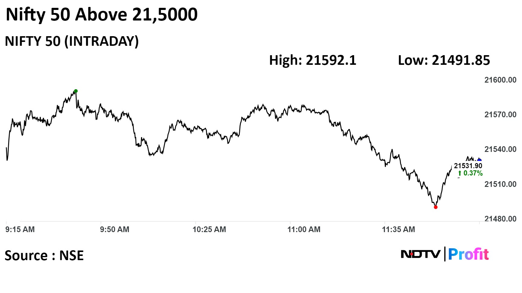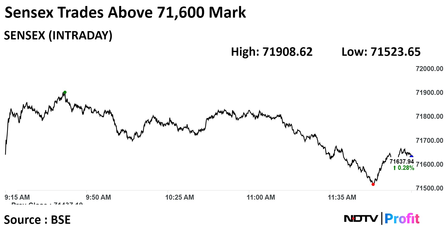 As of 12:01 p.m., the S&P BSE Sensex was 176.25 points, or 0.25% higher at 71,617.06, while the NSE Nifty 50 was 70.70 points, or 0.33% up at 21,521.80.