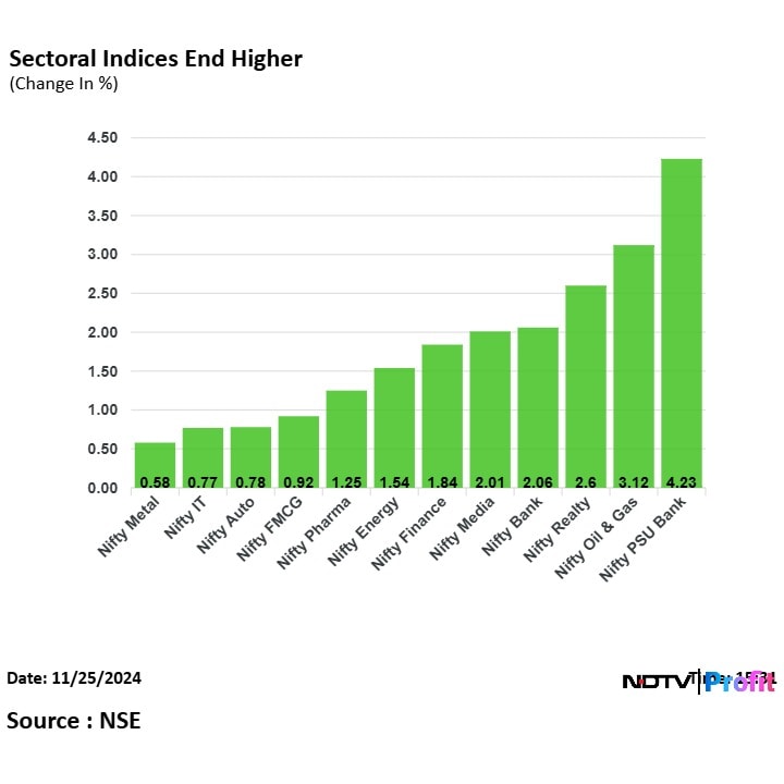 All the 12 sectoral indices on the NSE rose, with the Nifty PSU Bank gaining the most by over 4%