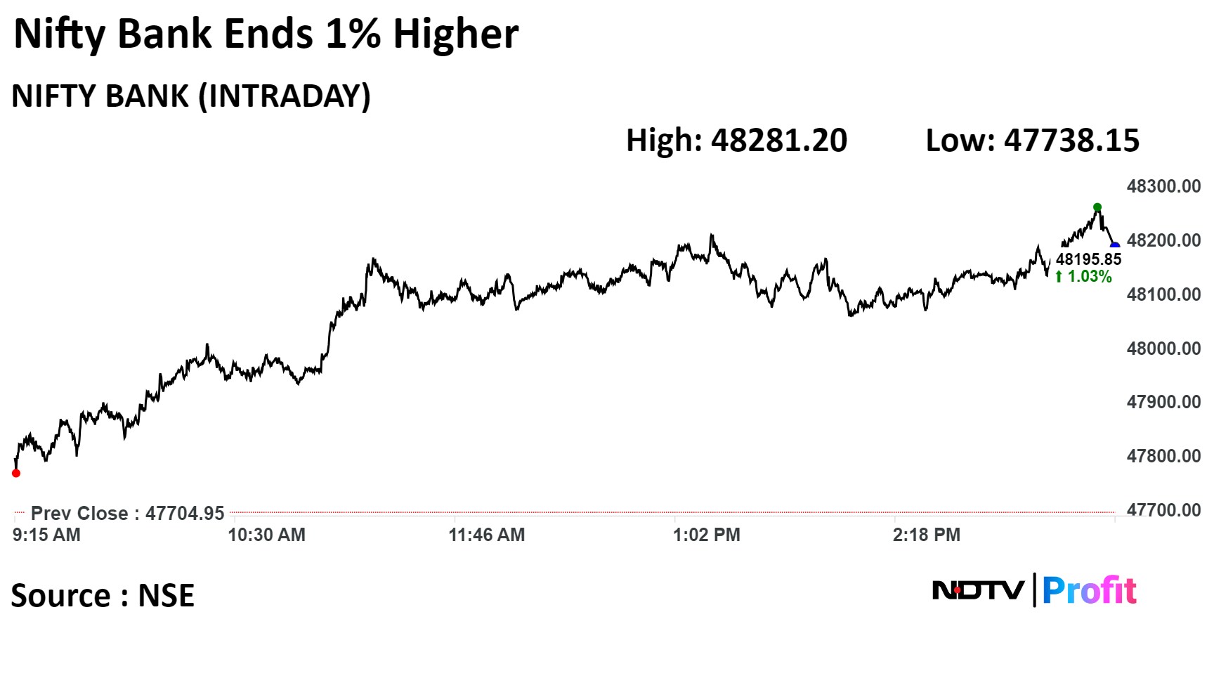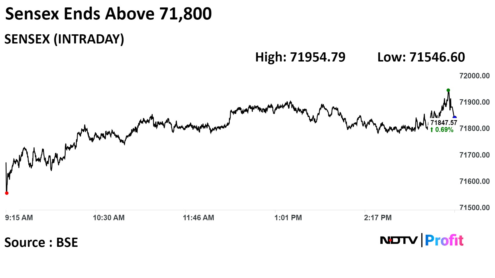 The NSE Nifty 50 ended 141 points or 0.66% higher at 21,658.60, while the S&P BSE Sensex gained 491 points or 0.69% to close at 71,847.57.