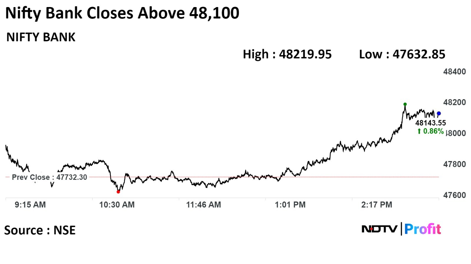 The Nifty Bank breached the 48,200 level for the first time during the last leg of the trade. The index settled at 0.86% or 411 points, higher at 48,143.55.