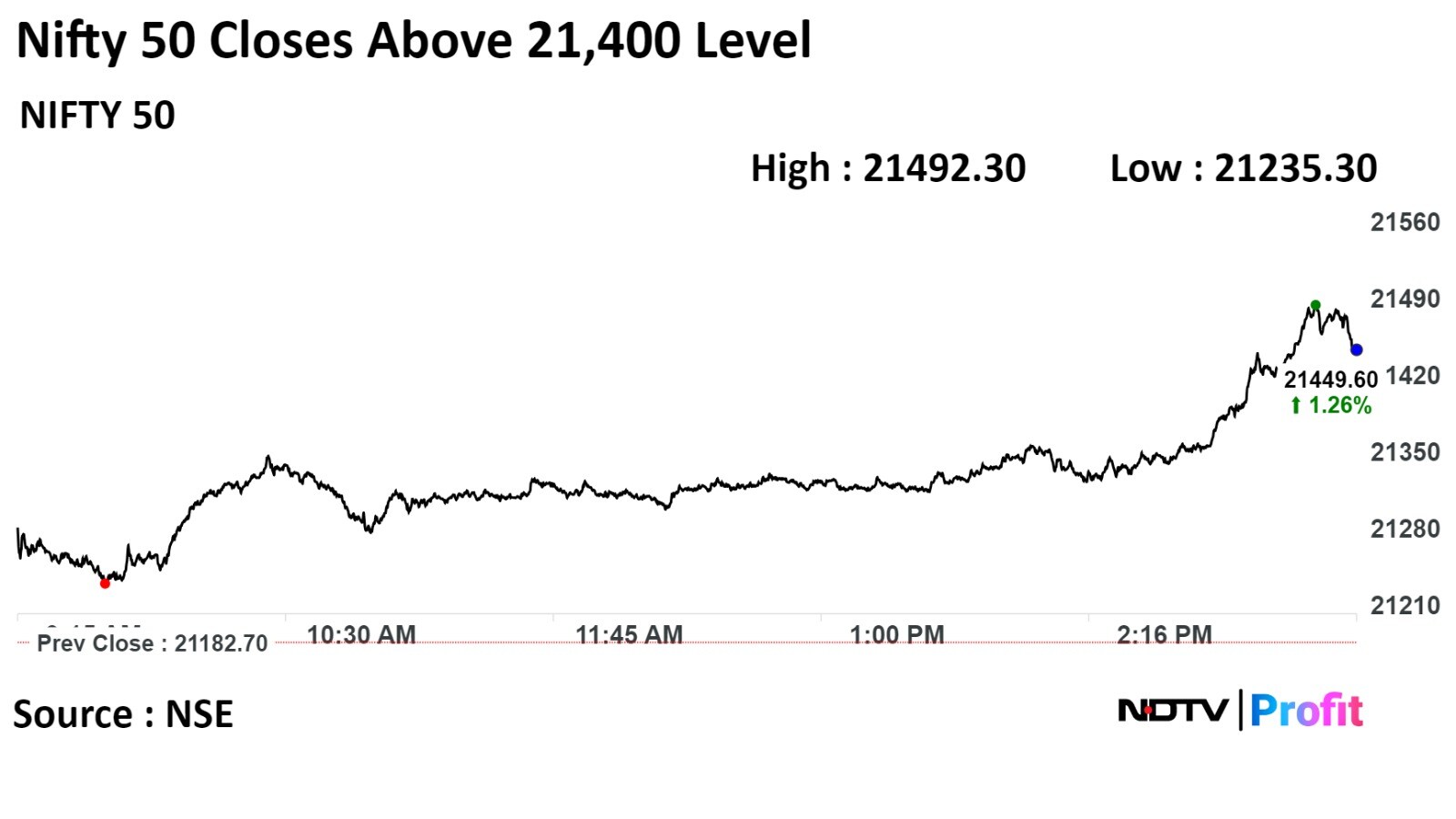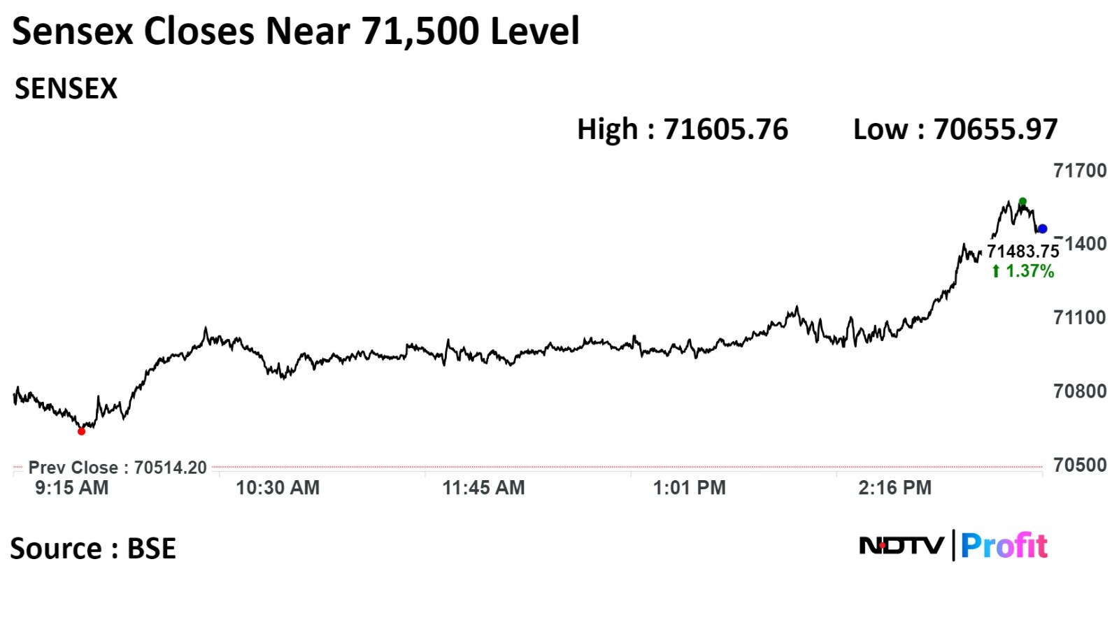 The NSE Nifty 50 jumped 274 points or 1.29%, to 21,456.65, while the S&P BSE Sensex surged 970 points or 1.37%, to close at 71,483.75.