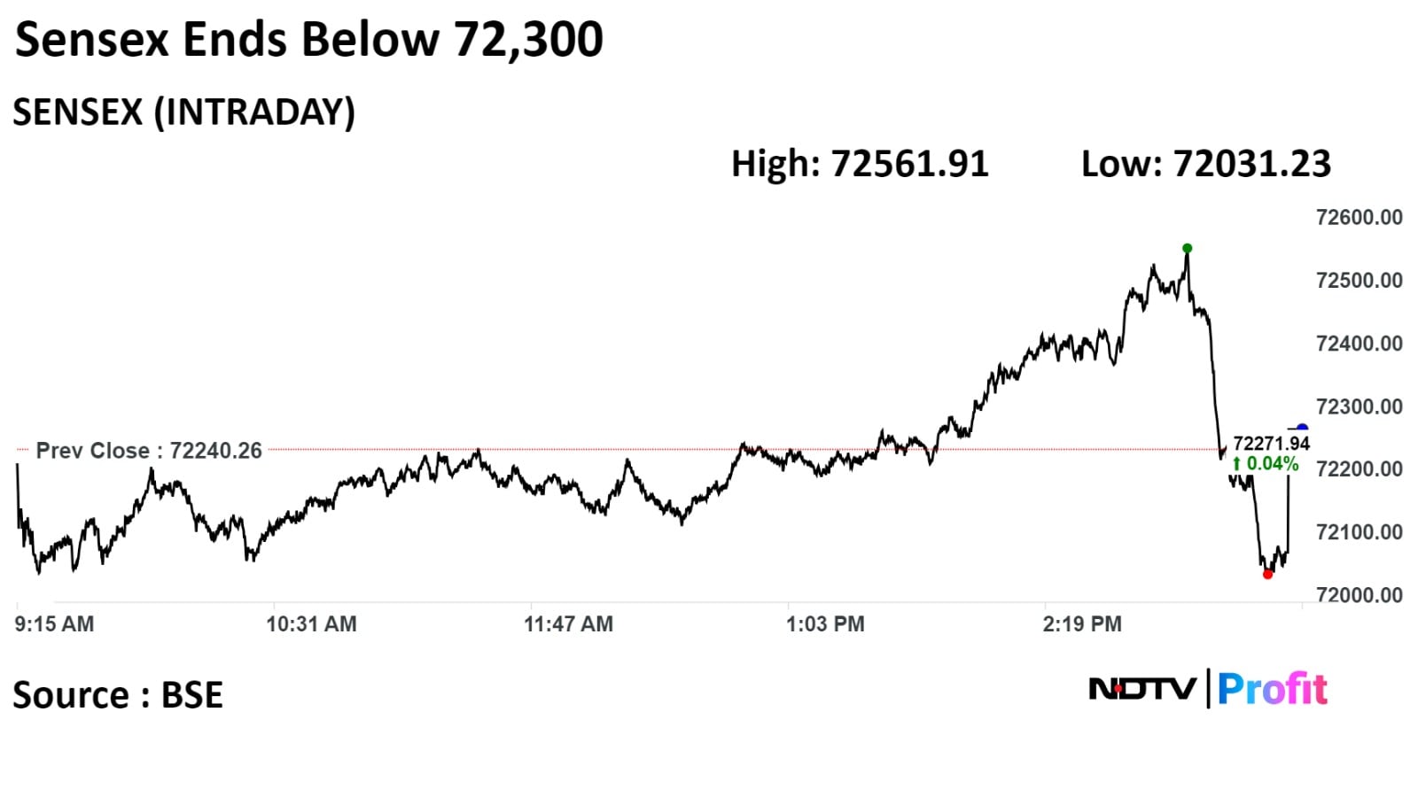 The S&P BSE Sensex settled 31.68 points, or 0.04%, higher at 72,271.94, while the NSE Nifty 50 gained 10.50 points, or 0.05%, to end at 21,741.90.