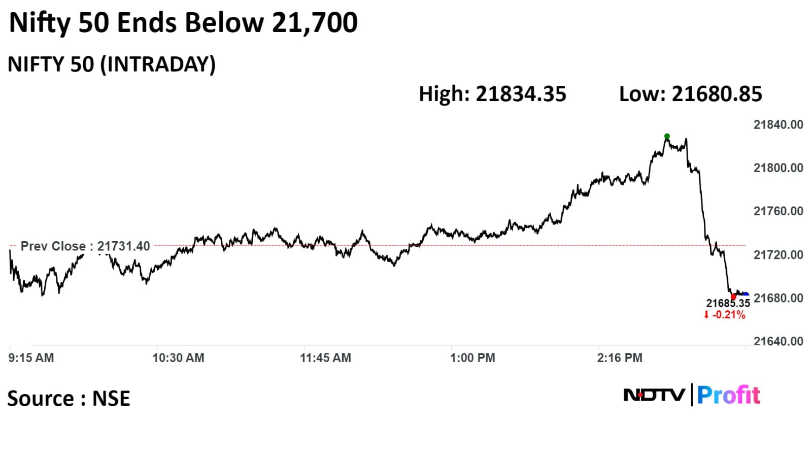 "Mid and small caps extended their morning gains and outperformed the frontline index. On the daily chart, the index has formed a Gravestone Doji candlestick pattern, which indicates the rejection at the higher end. The possibility of a bearish divergence still persists and if the same is confirmed, then we can see a correction to 21,500. On the flip side, a convincing close above 21,800 will be considered a failure of divergence," he said.