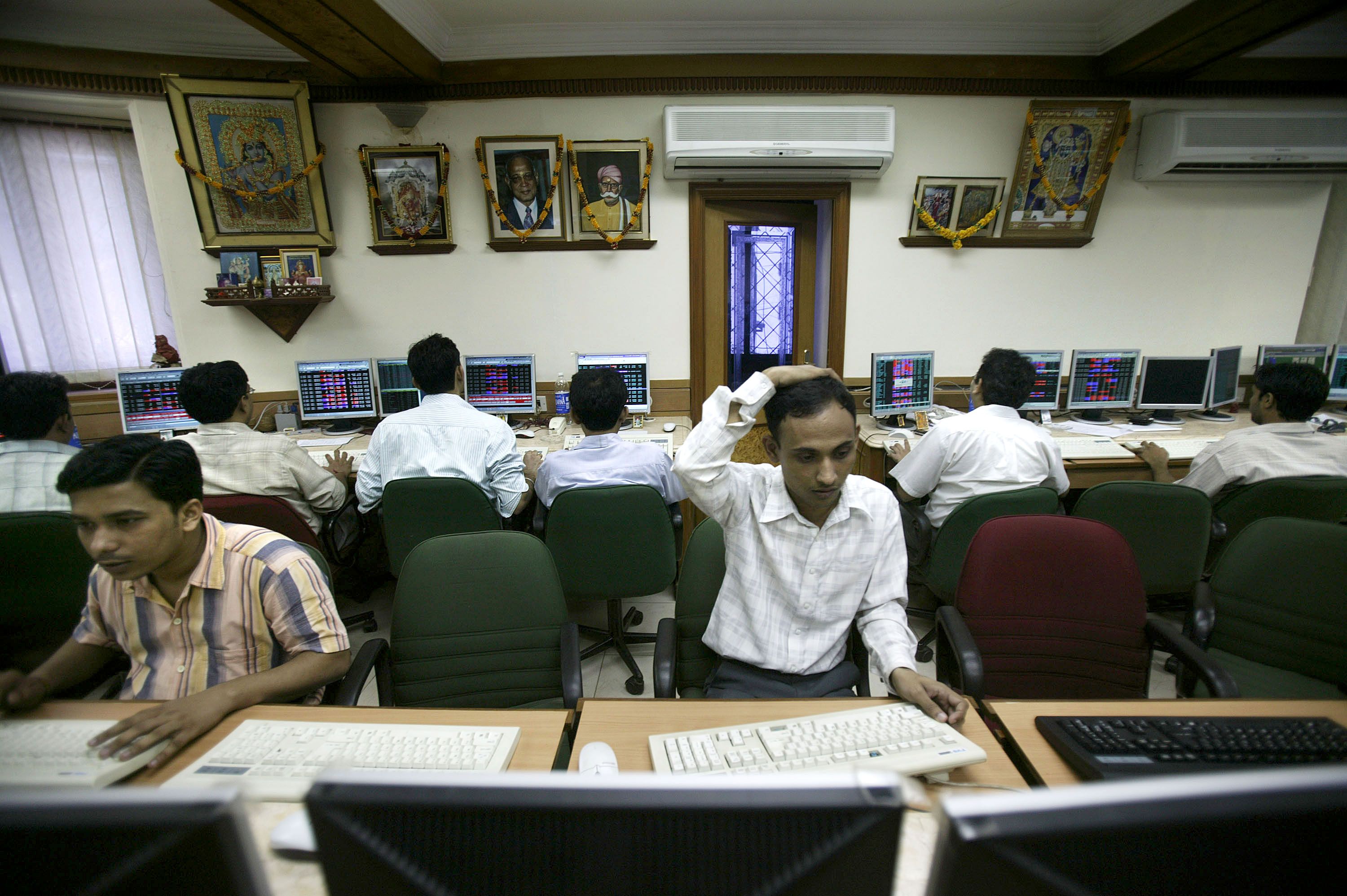 A broker reacts while trading at a brokerage firm in Mumbai, India. (Photographer: Adeel Halim/Bloomberg News)