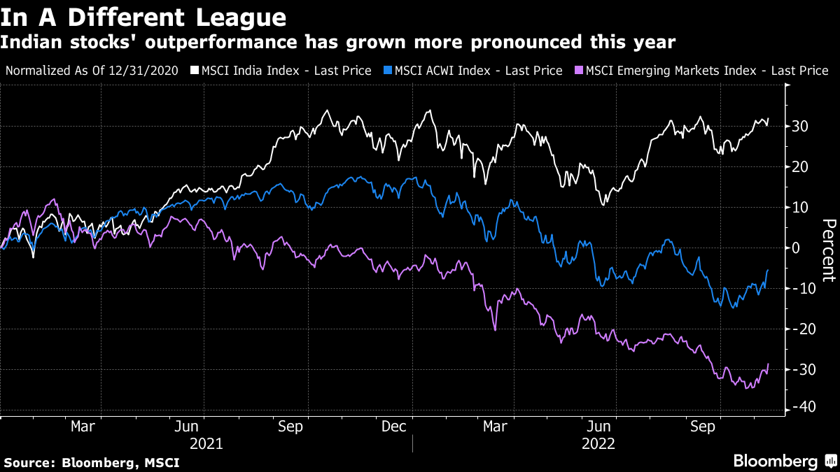 The Sensex's gain of 6.1% this year has put it on course for a seventh straight annual advance. That compares with a loss of more than 24% in the MSCI Emerging Markets Index. The MSCI All-Country World Index is down about 19% in 2022.