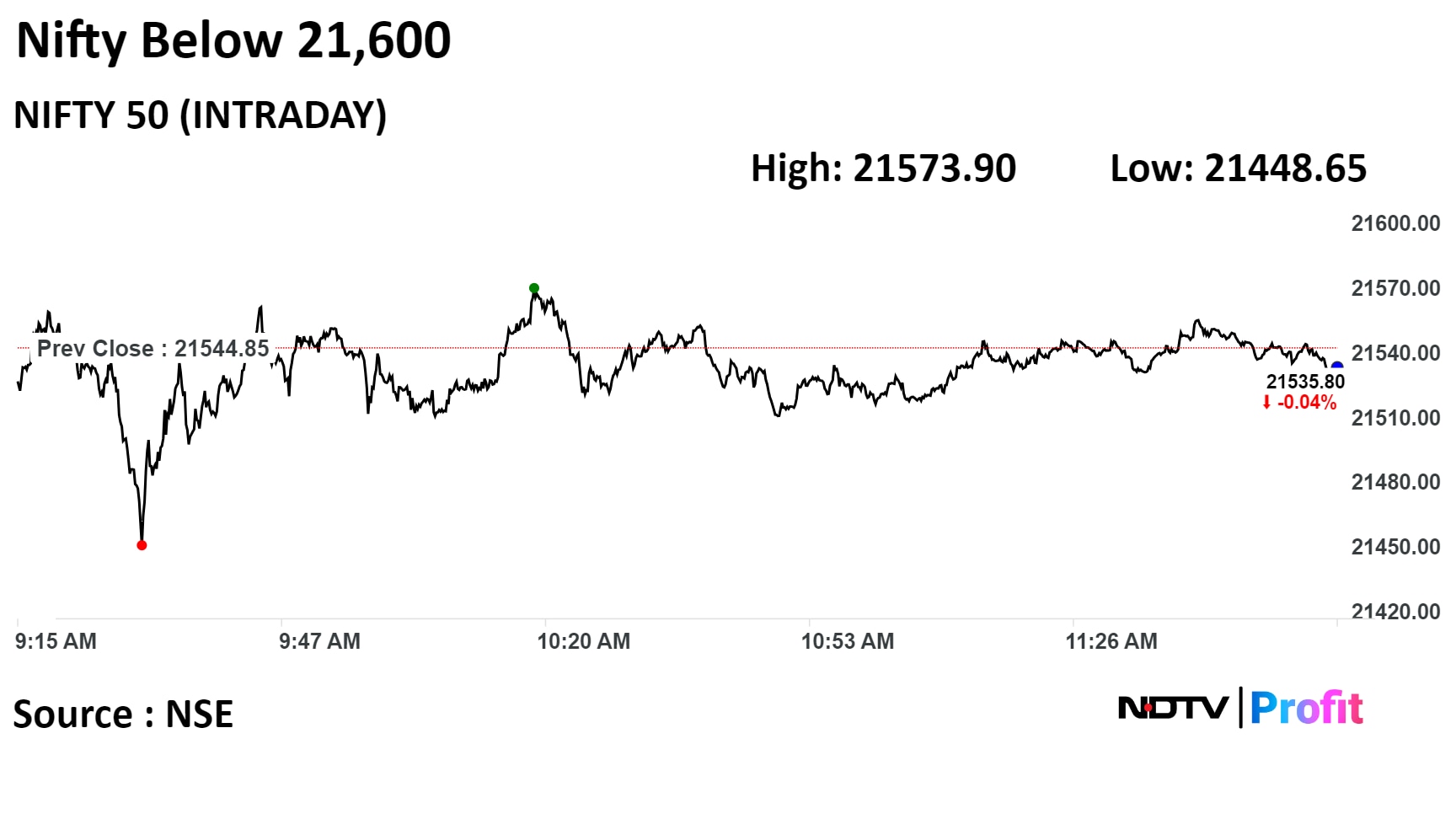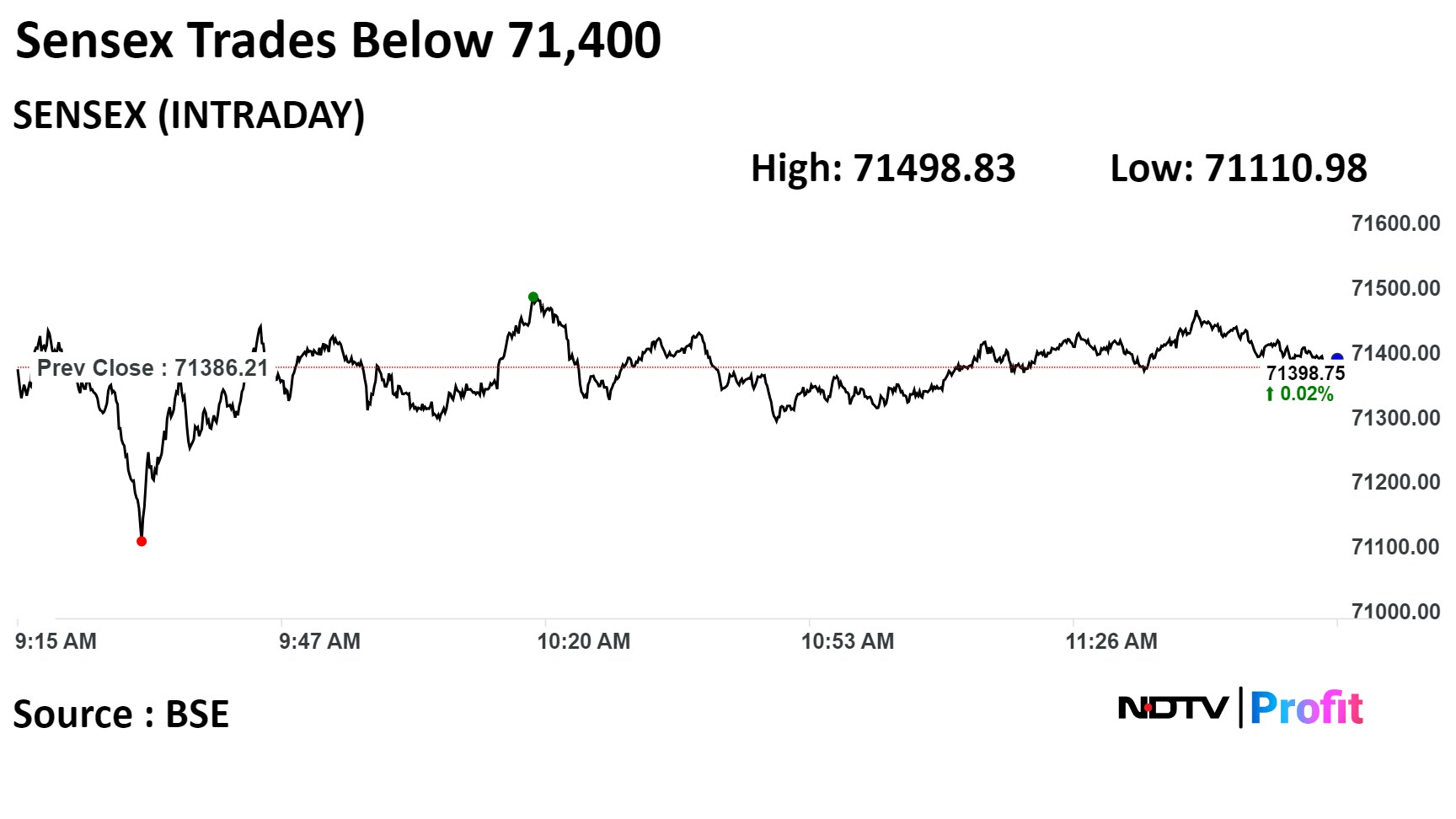 As of 11:55 a.m., the S&P BSE Sensex rose 0.03%, or 21.58 points, to 71,404.79, while the NSE Nifty 50 lost 0.02%, or 4.25 points, to trade at 21,540.60. The Sensex rose to an intraday high of 71,498.83, and the Nifty 50 touched 21,573.90.