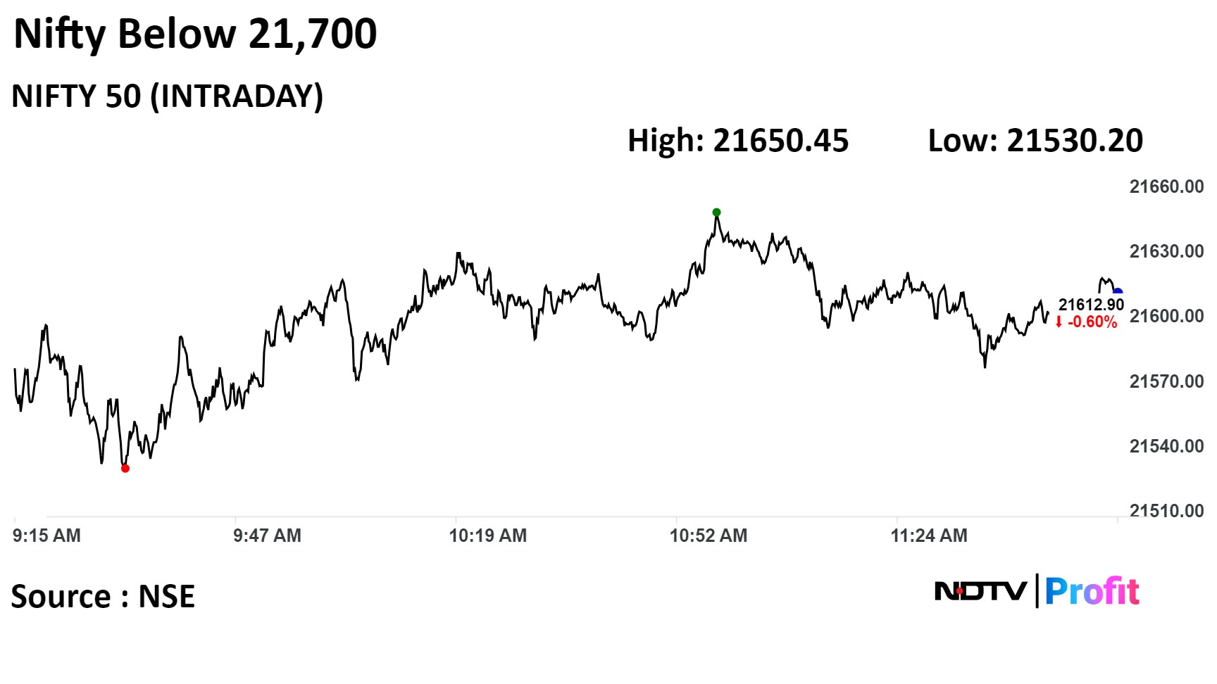 As of 11:57 a.m., the NSE Nifty 50 fell 126.55 points, or 0.58%, to 21,616.70, and the S&P BSE Sensex declined 476.46 points, or 0.67%, to 71,078.73.